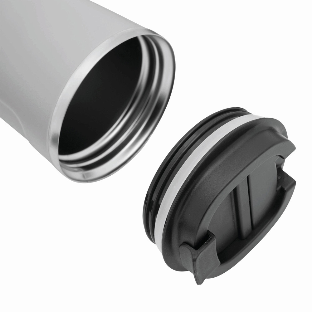 Vakuum-Isolierbecher COFFEE TIME, doppelwandig: innen und außen aus Edelstahl, schwarzer Kunststoff-Deckel mit sicherem Schraubverschluss, Silikon-Dichtring und integrierter Trinköffnung zum Aufklappen, Füllmenge ca. 500 ml, hält ca. 8 Stunden warm und bis zu 12 Stunden kalt, in Box