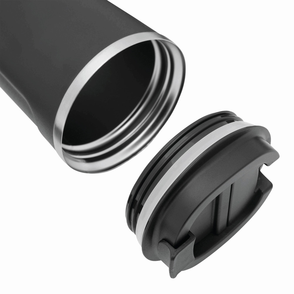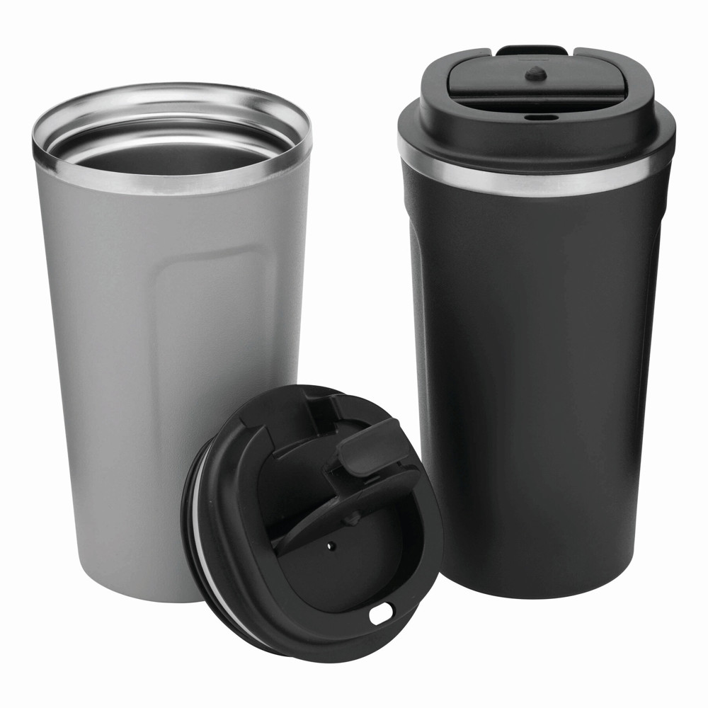 Vakuum-Isolierbecher COFFEE TIME, doppelwandig: innen und außen aus Edelstahl, schwarzer Kunststoff-Deckel mit sicherem Schraubverschluss, Silikon-Dichtring und integrierter Trinköffnung zum Aufklappen, Füllmenge ca. 500 ml, hält ca. 8 Stunden warm und bis zu 12 Stunden kalt, in Box