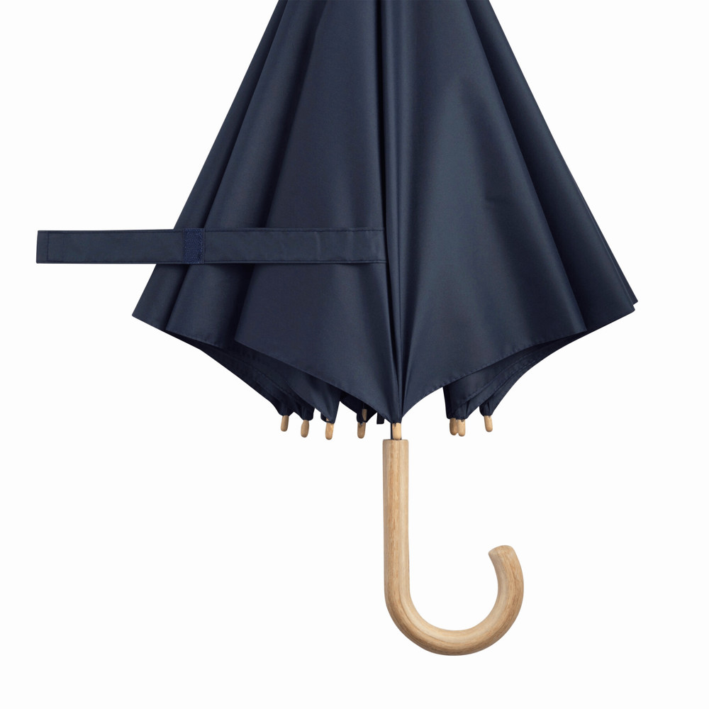 Automatik-Stockschirm LIPSI: Metallstock, Fiberglasspeichen, Holztips und -Rundhakengriff, Polyester-Pongee-Bespannung aus recycelten Kunststoffen / RPET, Schließband mit Klettverschluss