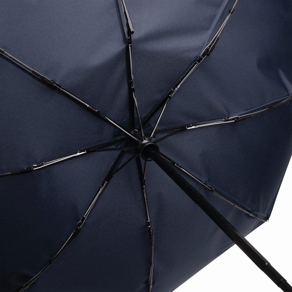 Vollautomatischer Windproof-Taschenschirm CALYPSO in farblich abgestimmtem Futteral: 3-teiliger Metallstock, mit Metall-Kunststoff-Fiberglasspeichen und Metalltips, Bambusgriff mit Handschlaufe, Polyester-Pongee-Bespannung aus recycelten Kunststoffen / RPET, Schließband mit Klettverschluss