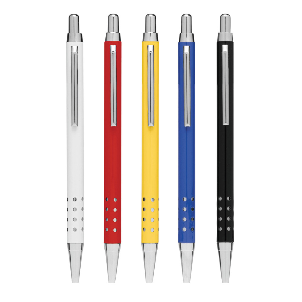Messing-Kugelschreiber BUDAPEST: mit Metall-Schaft, Griffzone mit Loch-Design, Druckmechanismus, Großraummine, blauschreibend