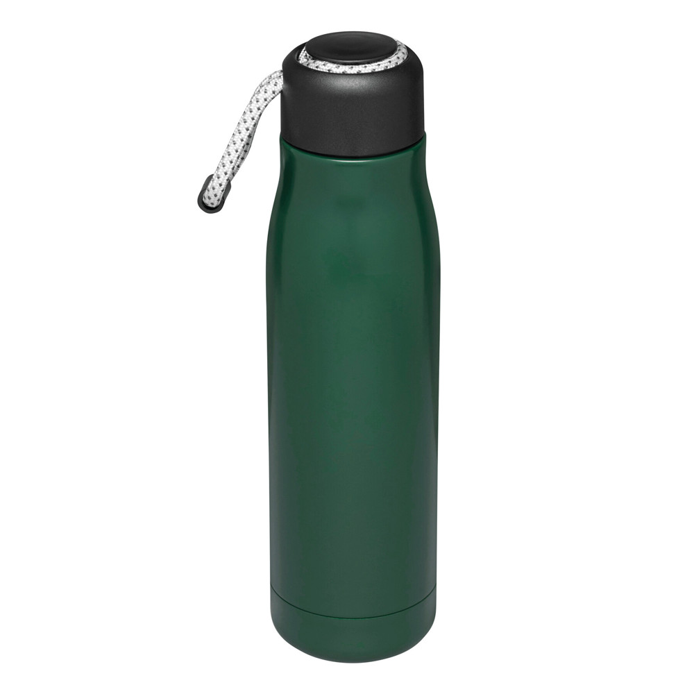 Vakuum-Isolierflasche ROBUSTA, doppelwandig: außen und innen aus Edelstahl, schwarzer Deckel mit sicherem Schraubverschluss und dekorativer Trageschlaufe, Füllmenge: ca. 500 ml, hält ca. 8 Stunden warm und bis zu 12 Stunden kalt