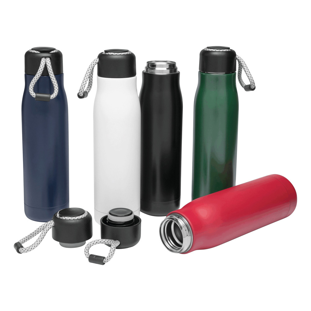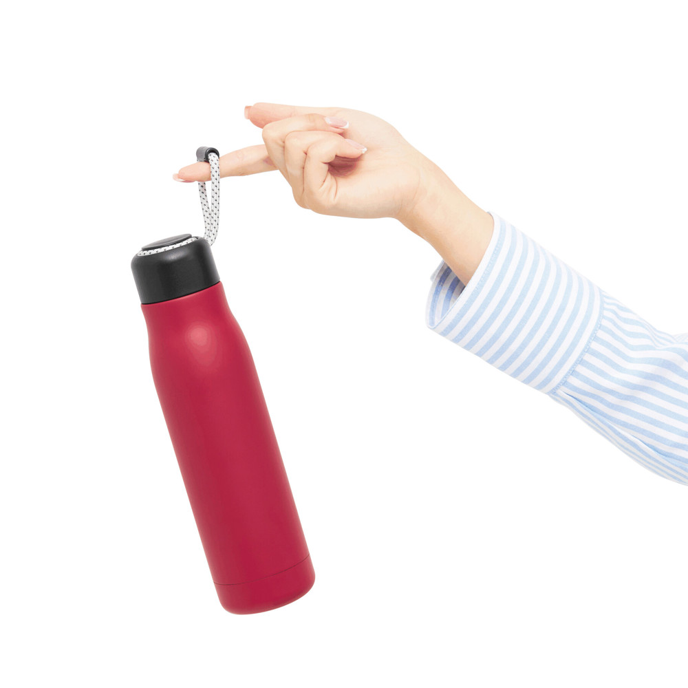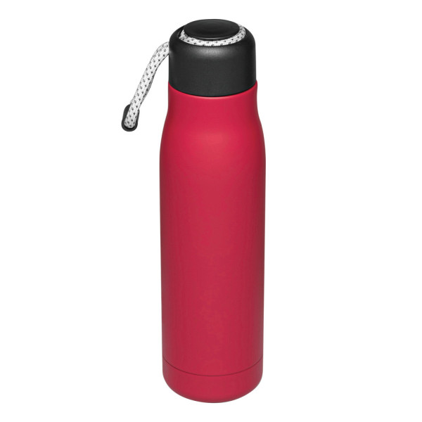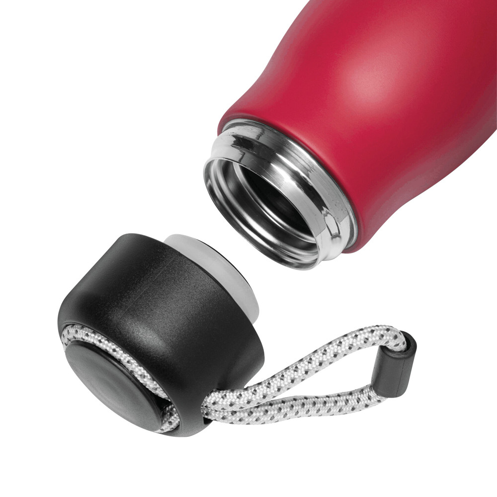 Vakuum-Isolierflasche ROBUSTA, doppelwandig: außen und innen aus Edelstahl, schwarzer Deckel mit sicherem Schraubverschluss und dekorativer Trageschlaufe, Füllmenge: ca. 500 ml, hält ca. 8 Stunden warm und bis zu 12 Stunden kalt