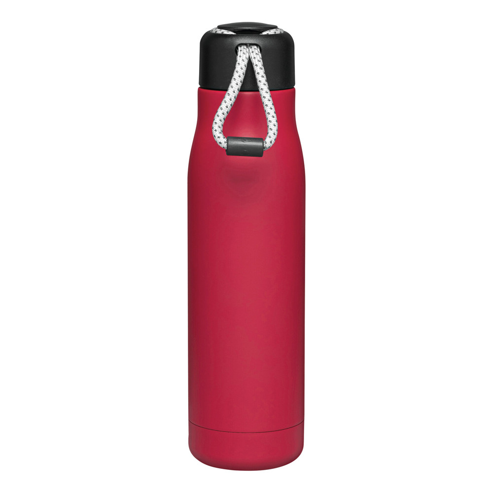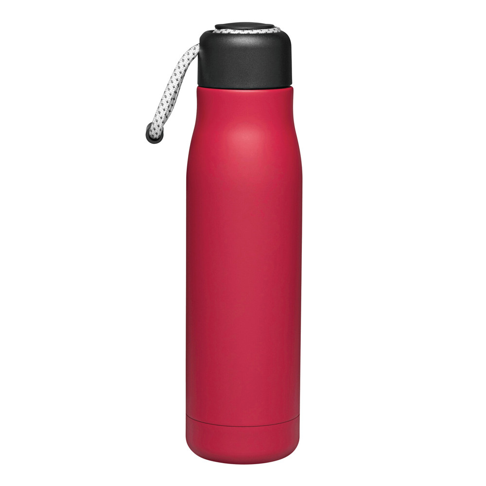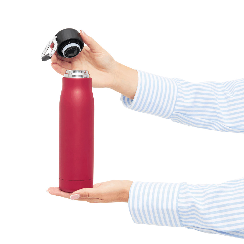 Vakuum-Isolierflasche ROBUSTA, doppelwandig: außen und innen aus Edelstahl, schwarzer Deckel mit sicherem Schraubverschluss und dekorativer Trageschlaufe, Füllmenge: ca. 500 ml, hält ca. 8 Stunden warm und bis zu 12 Stunden kalt