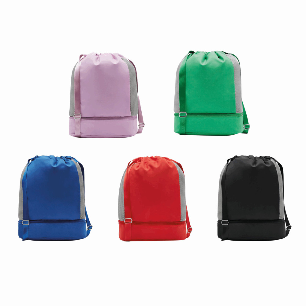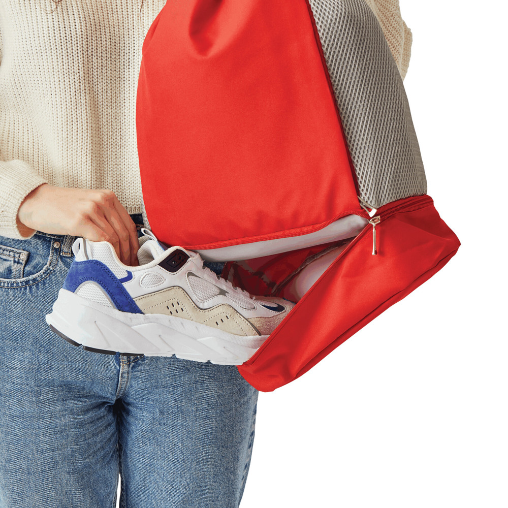 Rucksack TRIP: mit Gurtzug zum Verschließen und als Schultergurte (verstellbar), 1 großes Hauptfach mit 1 Reißverschluss-Innenfach und 2 Einsteckfächer, 2 vertikale Reißverschluss-Vortaschen, 1 Reißverschlussfach am Boden