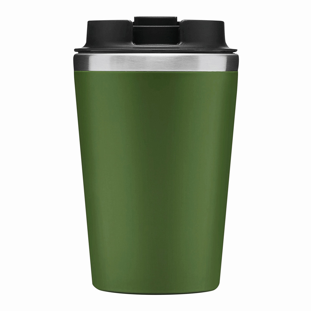 Trinkbecher TAKE & GO, doppelwandig: innen aus Edelstahl und außen aus Kunststoff, schwarzer Kunststoff-Deckel mit sicherem Schraubverschluss, Silikon-Dichtring und integrierter Trinköffnung zum Aufklappen, beschichteter Boden für gute Oberflächenhaftung, Füllmenge ca. 350 ml, hält ca. 2 Stunden warm und bis zu 4 Stunden kalt