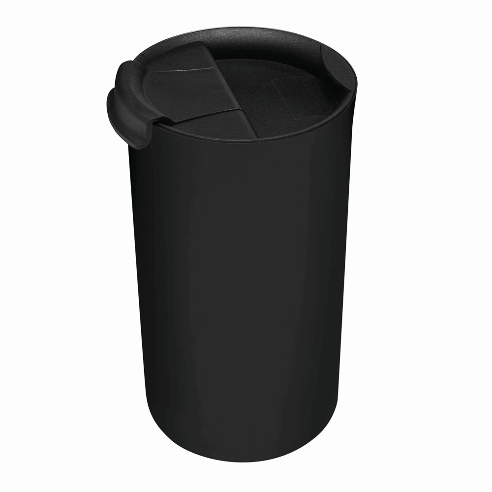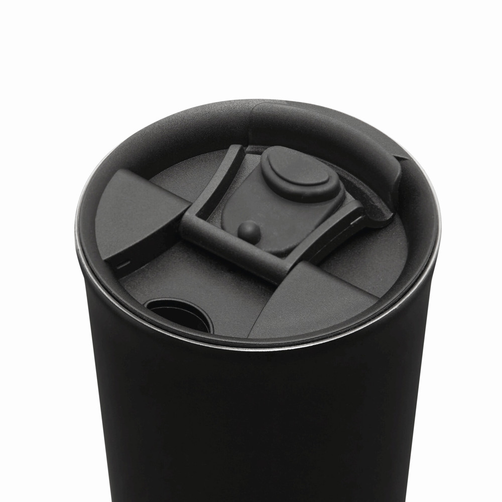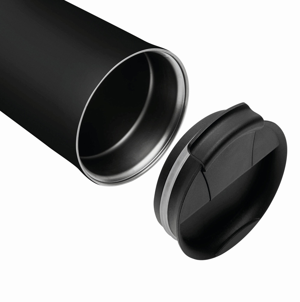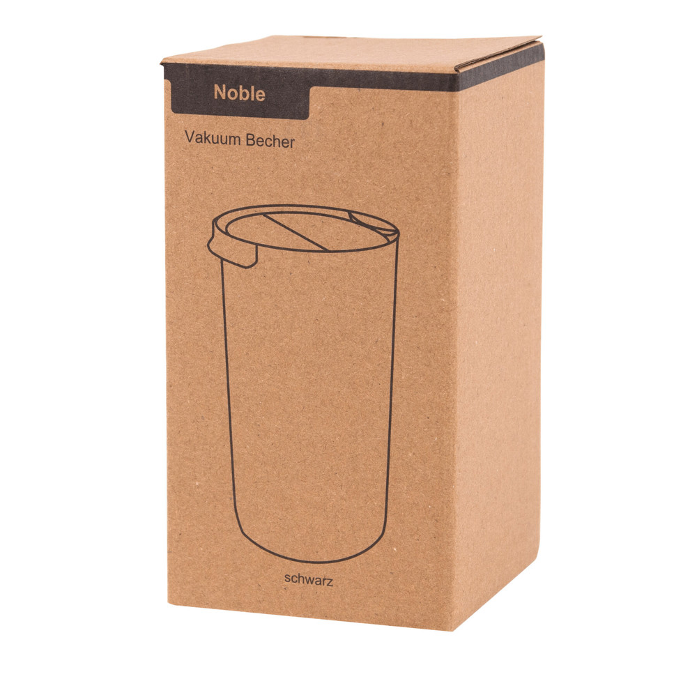 Vakuum-Isolierbecher NOBLE, doppelwandig: innen und außen aus Edelstahl, schwarzer Kunststoff-Deckel mit Silikon-Dichtring, integrierter Trinköffnung zum Aufklappen, Füllmenge ca. 450 ml, hält ca. 8 Stunden warm und bis zu 12 Stunden kalt, in Box