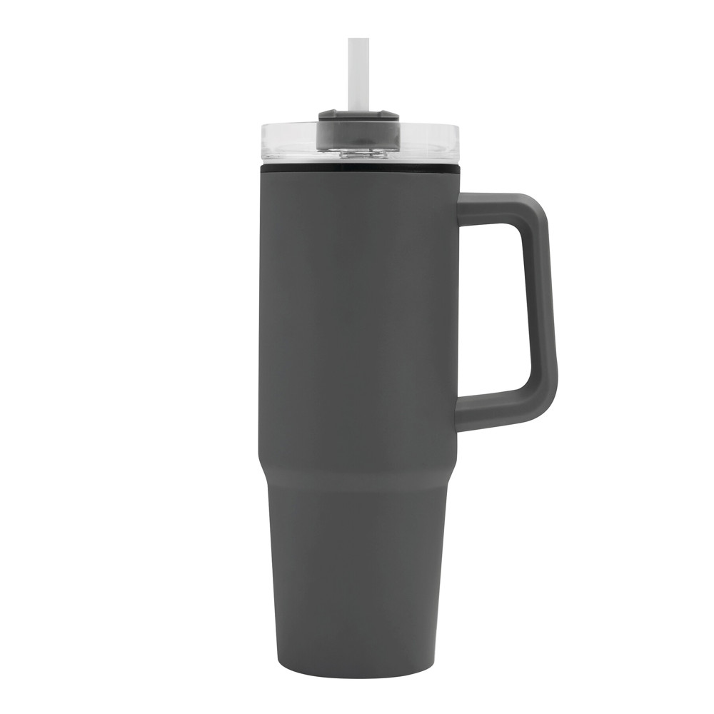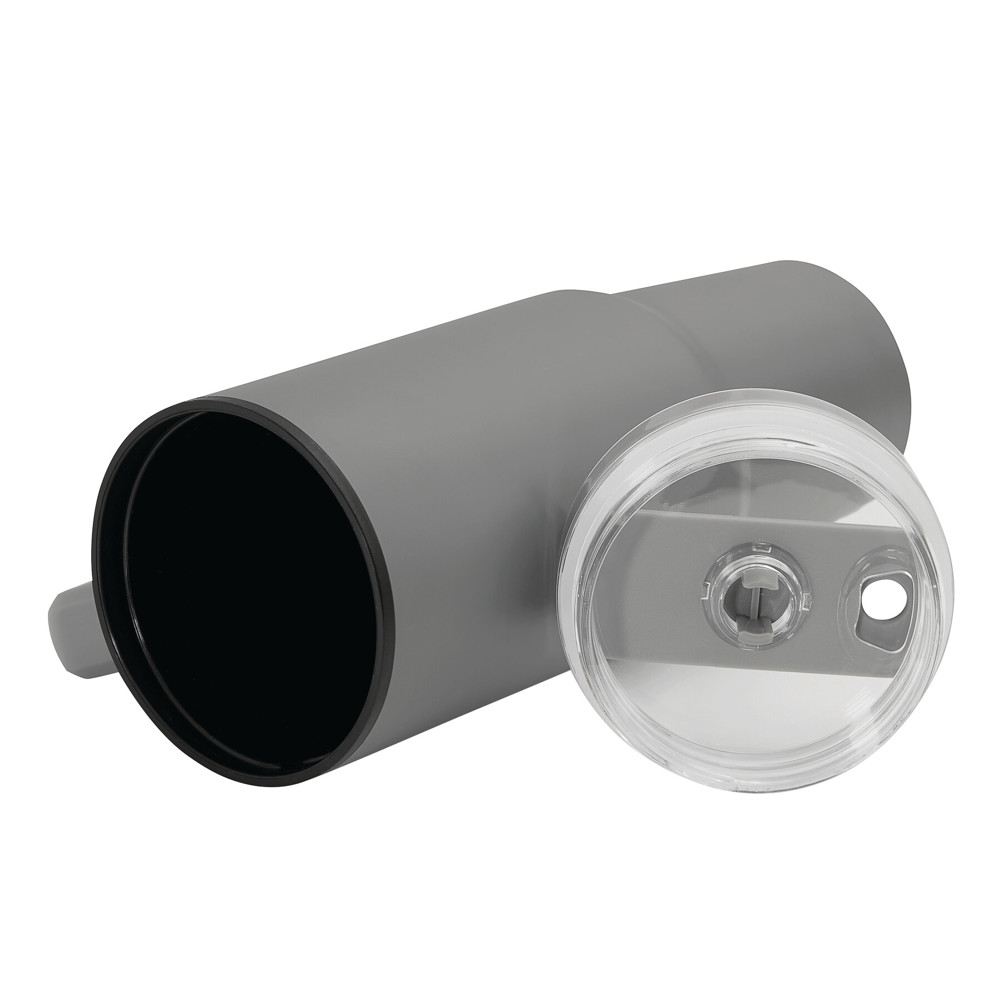Trinkbecher DRINK ULTY, doppelwandig: innen aus Kunststoff und außen aus Edelstahl, mit praktischem Griff, transparenter Kunststoff-Deckel mit sicherem Schraubverschluss, Silikon-Dichtring, Trinköffnung mit Drehverschluss und transparentem Strohhalm, beschichteter Boden für gute Oberflächenhaftung, Füllmenge ca. 900 ml, hält ca. 2 Stunden warm und bis zu 4 Stunden kalt, in Box