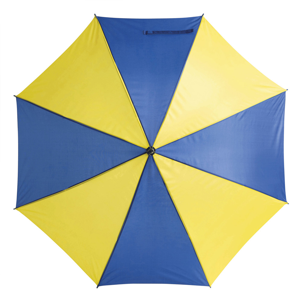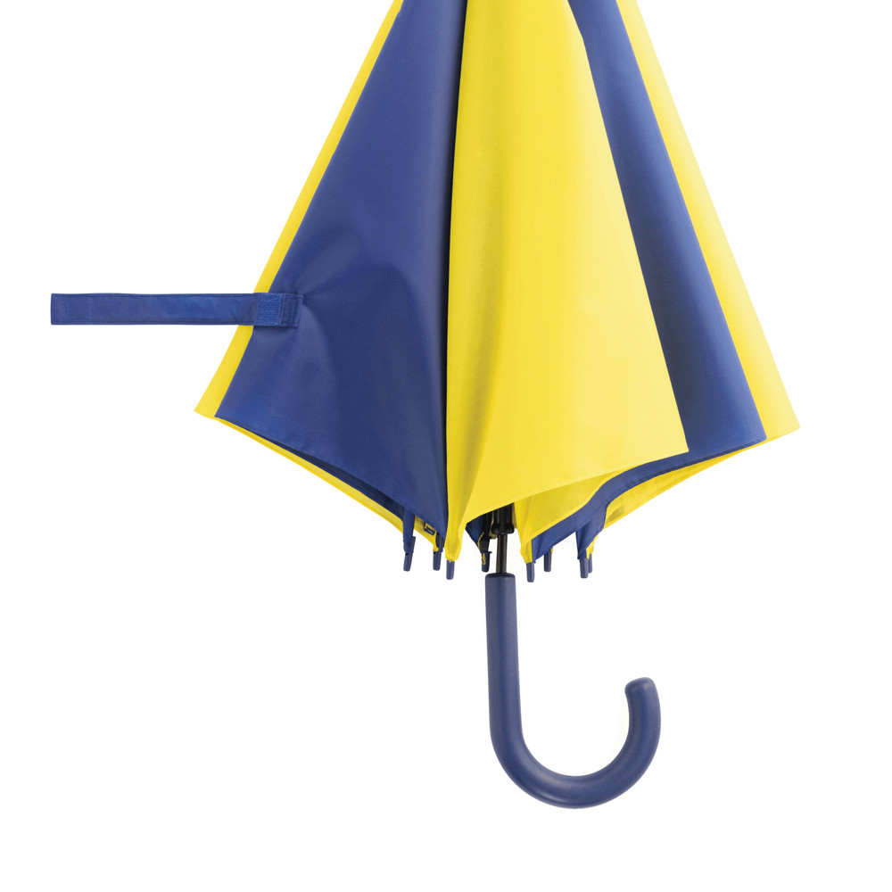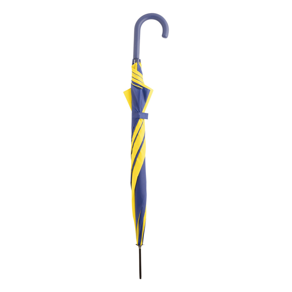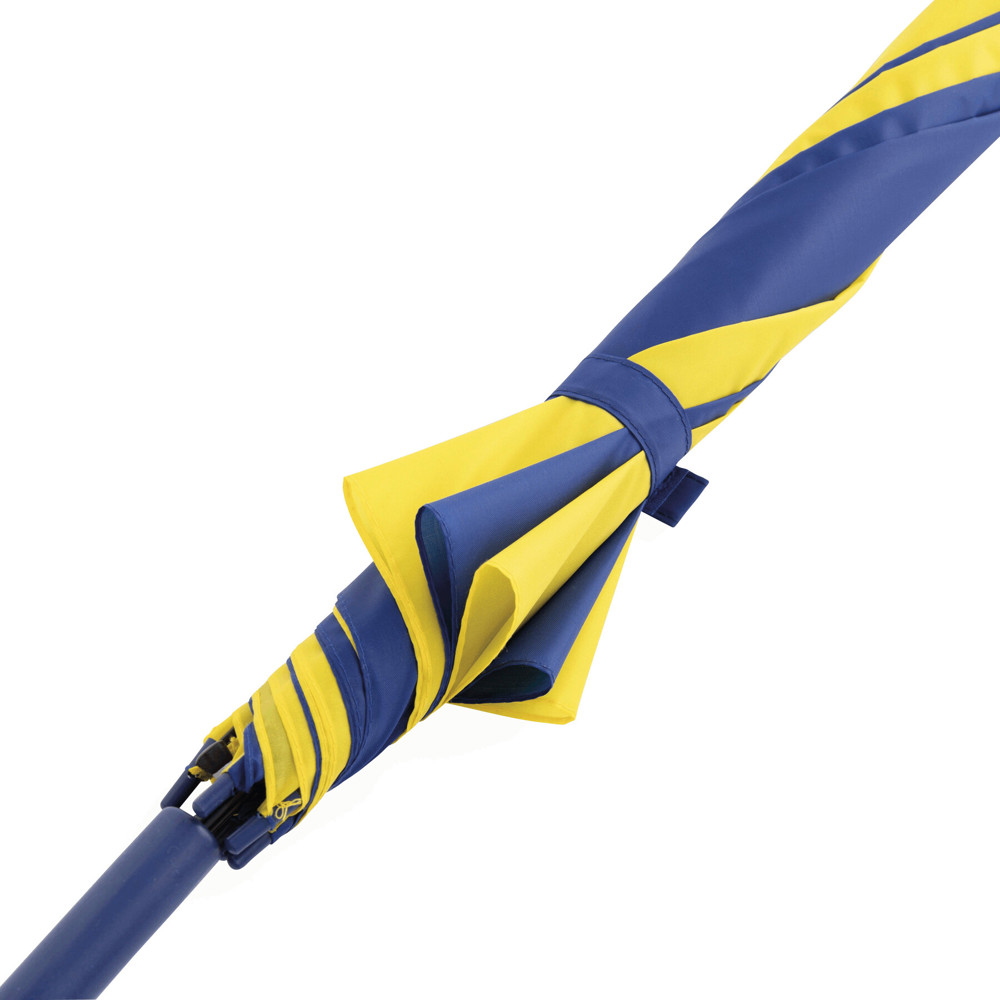 Automatischer Stockschirm DISCO: Metallstock und -speichen, Kunststofftips und -Rundhakengriff, Polyester-Bespannung, Schließband mit Klettverschluss