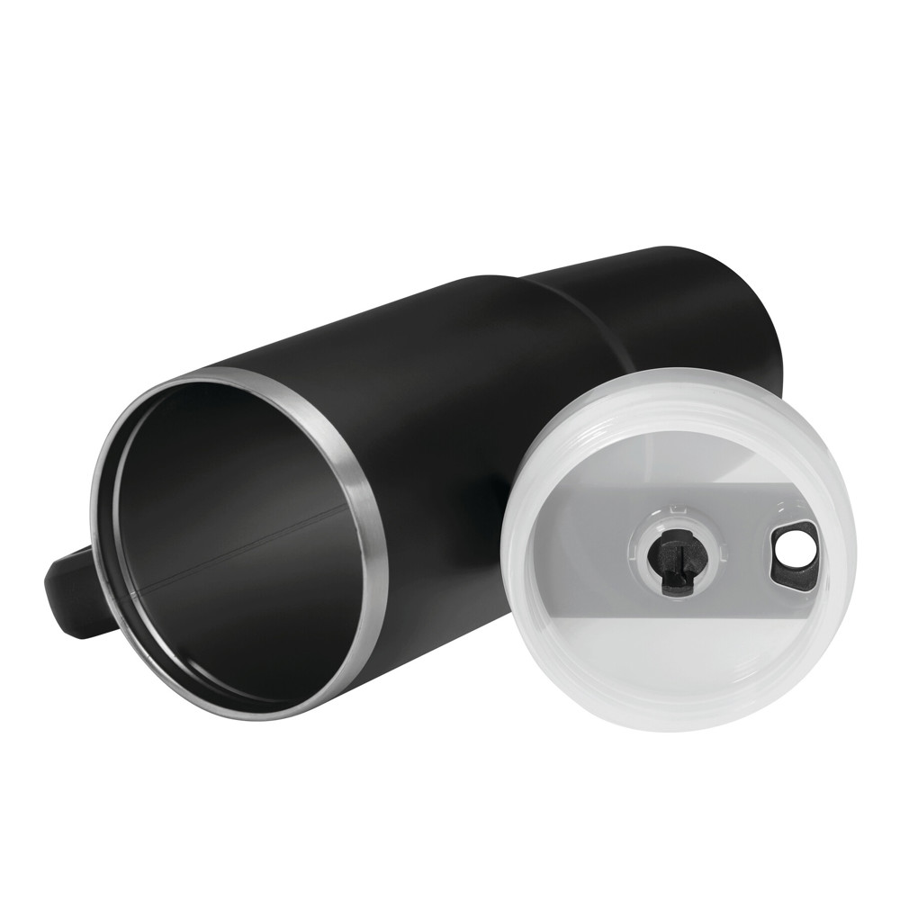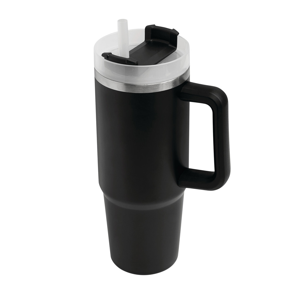 Vakuum-Isolierbecher DRINK DELUXE, doppelwandig: innen und außen aus Edelstahl, mit praktischem Griff, milchig-transparenter Kunststoff-Deckel mit sicherem Schraubverschluss, Silikon-Dichtring, Trinköffnung mit Drehverschluss und transparentem Strohhalm, beschichteter Boden für gute Oberflächenhaftung, Füllmenge ca. 900 ml, hält ca. 5 Stunden warm und bis zu 10 Stunden kalt, in Box