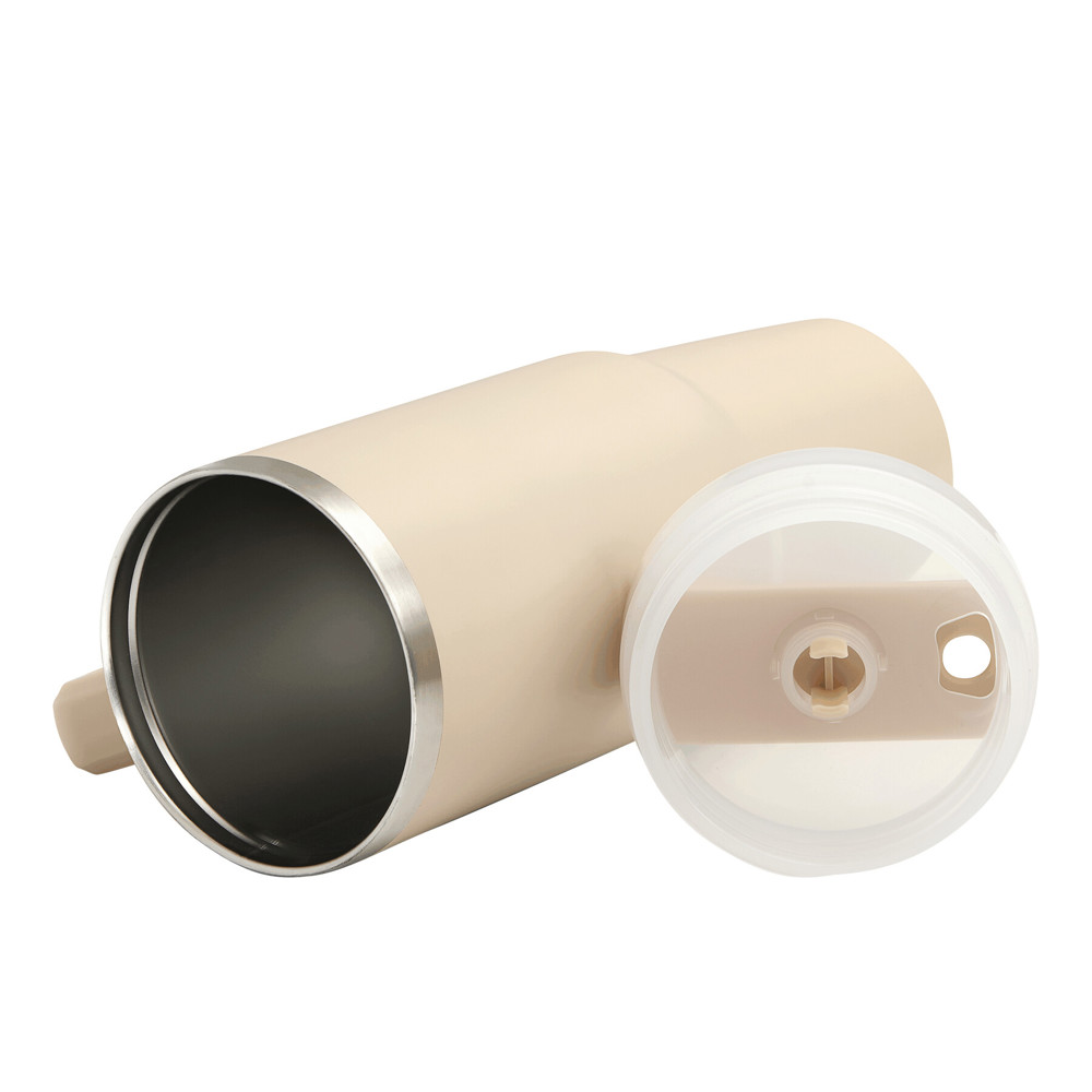 Vakuum-Isolierbecher DRINK DELUXE, doppelwandig: innen und außen aus Edelstahl, mit praktischem Griff, milchig-transparenter Kunststoff-Deckel mit sicherem Schraubverschluss, Silikon-Dichtring, Trinköffnung mit Drehverschluss und transparentem Strohhalm, beschichteter Boden für gute Oberflächenhaftung, Füllmenge ca. 900 ml, hält ca. 5 Stunden warm und bis zu 10 Stunden kalt, in Box