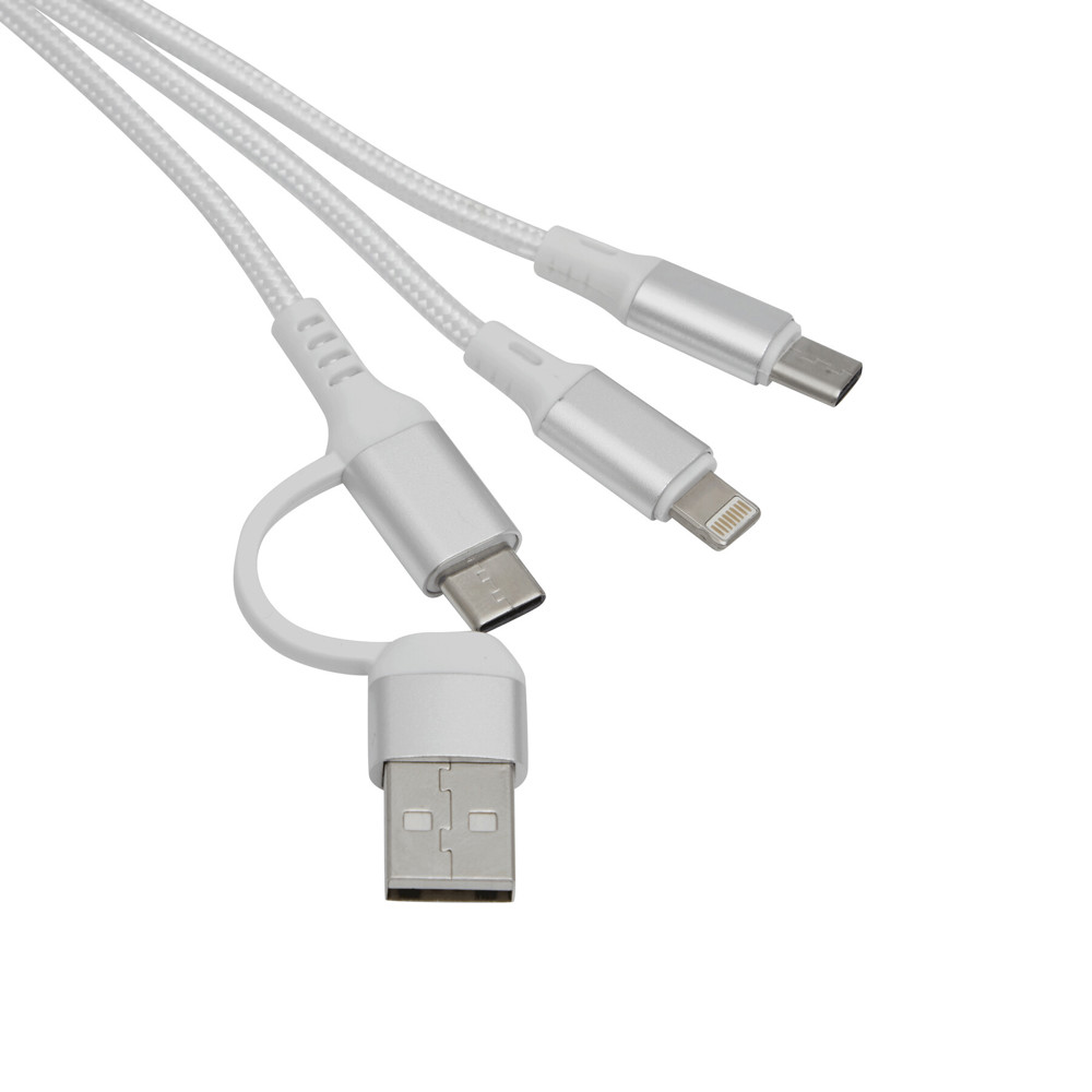 Ladekabel FANTAIL: zum Aufladen von Smartphones und USB-betriebenen Geräten, inkl. 2 Ladesteckern (USB Typ C, Kombistecker Micro-USB/Lightning®), Kabellänge ca. 18 cm, kombinierter USB Typ A / Typ C Eingangsstecker, mit Schlüsselring