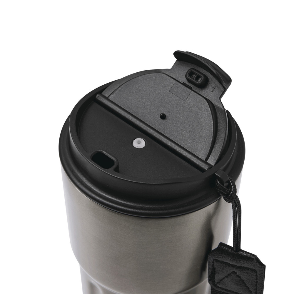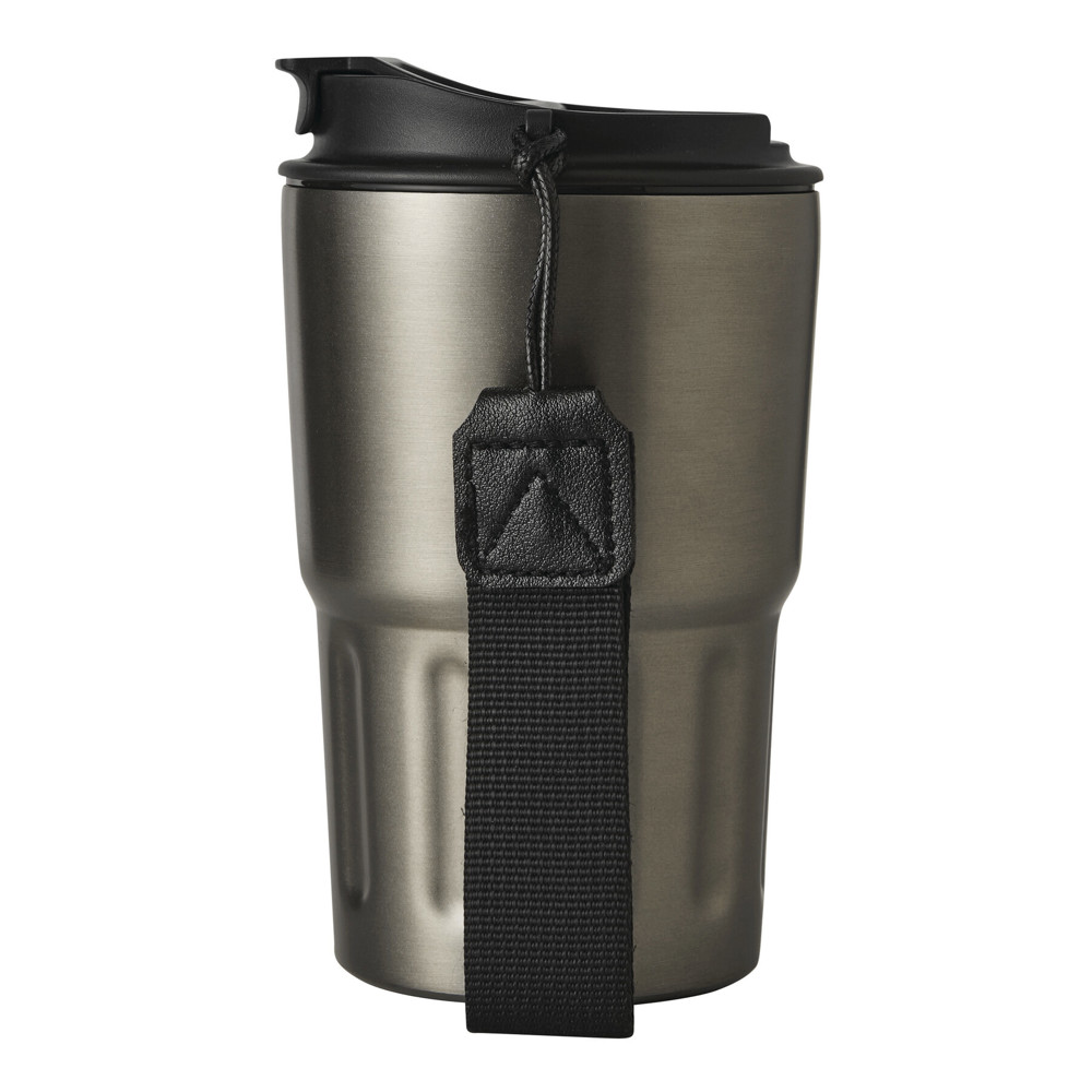 Vakuum-Trinkbecher TRAVEL MUG, doppelwandig: innen und außen aus Edelstahl, matte Pulverlackierung, schwarzer Kunststoff-Deckel mit sicherem Schraubverschluss, Silikon-Dichtring, integrierter Trinköffnung zum Aufklappen und Trageschlaufe aus recyceltem Kunststoff, Füllmenge ca. 400 ml, hält ca. 8 Stunden warm und bis zu 12 Stunden kalt, in Box