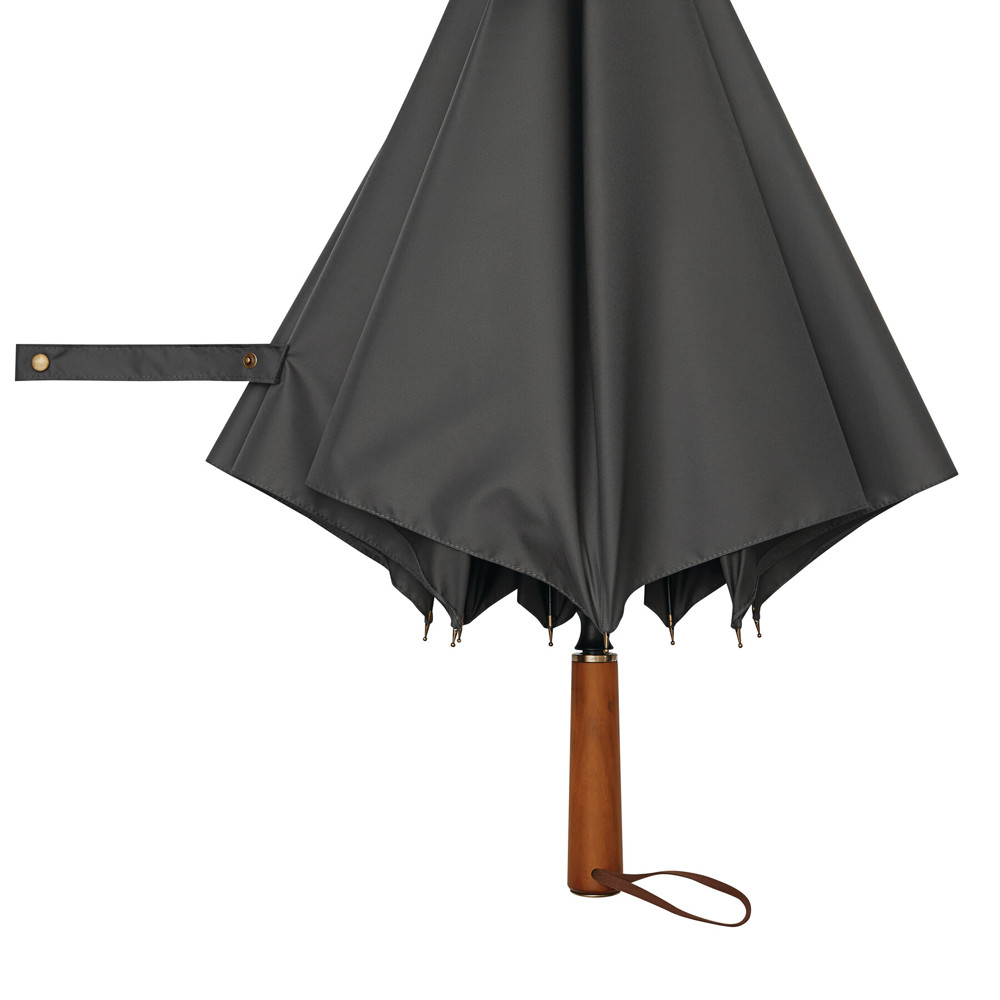 Automatik-Stockschirm POLKA: schwarzer Metallstock, Fiberglasspeichen und Metalltips, gerader Holzgriff mit messingfarbener Automatik-Auslösetaste, Griff mit „CREADO“-Doming, hochwertige Polyester-Pongee-Bespannung und -Hülle, Schließband mit Druckknopf