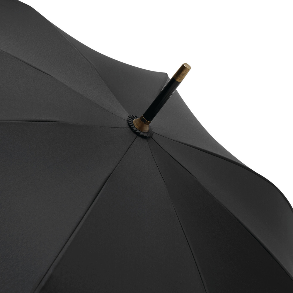 Automatik-Stockschirm POLKA: schwarzer Metallstock, Fiberglasspeichen und Metalltips, gerader Holzgriff mit messingfarbener Automatik-Auslösetaste, Griff mit „CREADO“-Doming, hochwertige Polyester-Pongee-Bespannung und -Hülle, Schließband mit Druckknopf