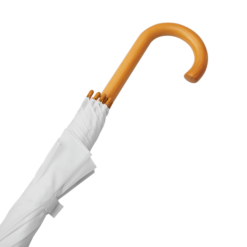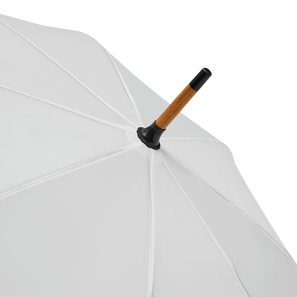 Automatik-Holzstockschirm JAZZ: Fiberglasspeichen, Holztips und -Rundhakengriff, Polyester-Bespannung aus recycelten Kunststoffen / RPET, Schließband mit Klettverschluss