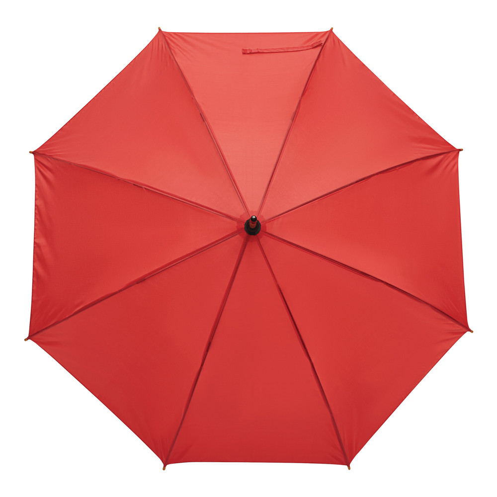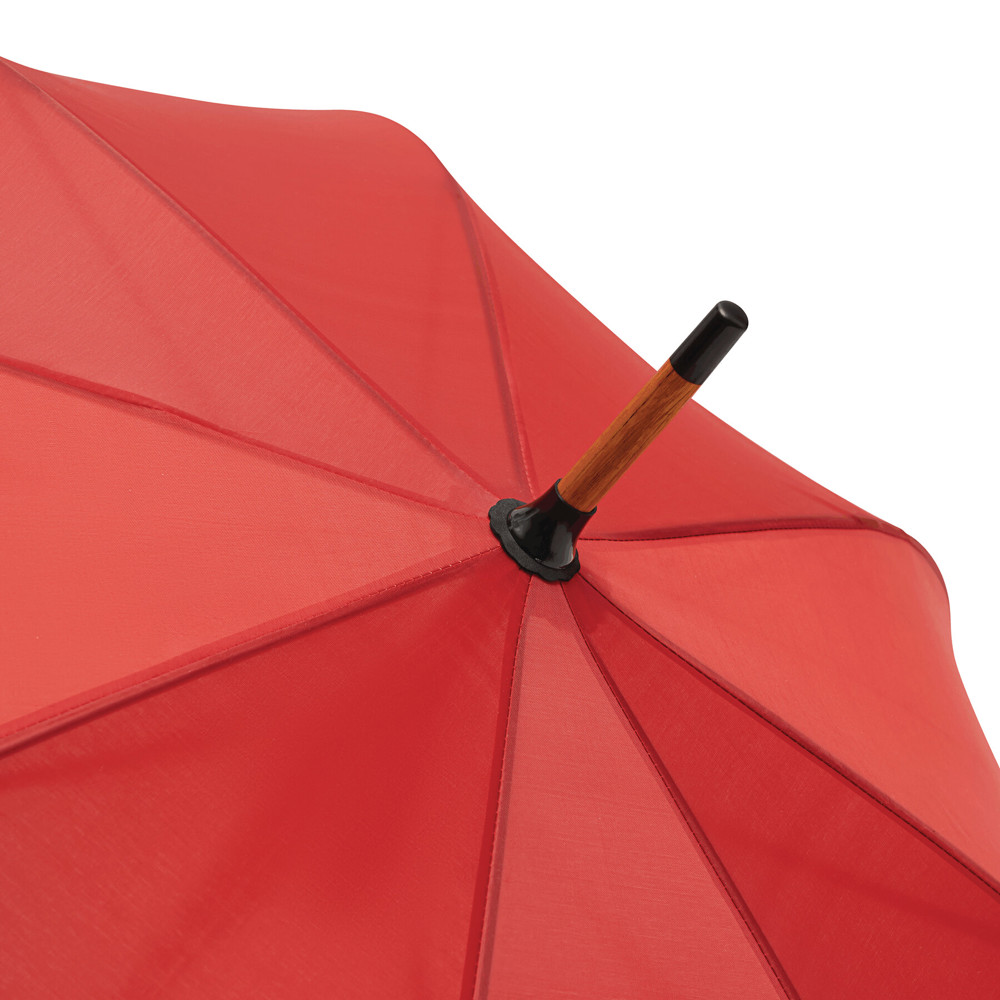 Automatik-Holzstockschirm JAZZ: Fiberglasspeichen, Holztips und -Rundhakengriff, Polyester-Bespannung aus recycelten Kunststoffen / RPET, Schließband mit Klettverschluss