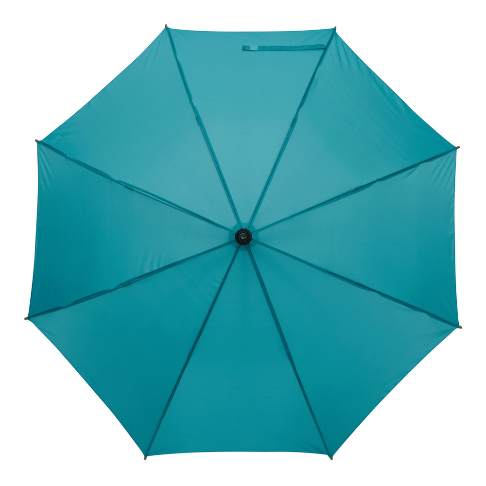 Automatik-Holzstockschirm JAZZ: Fiberglasspeichen, Holztips und -Rundhakengriff, Polyester-Bespannung aus recycelten Kunststoffen / RPET, Schließband mit Klettverschluss