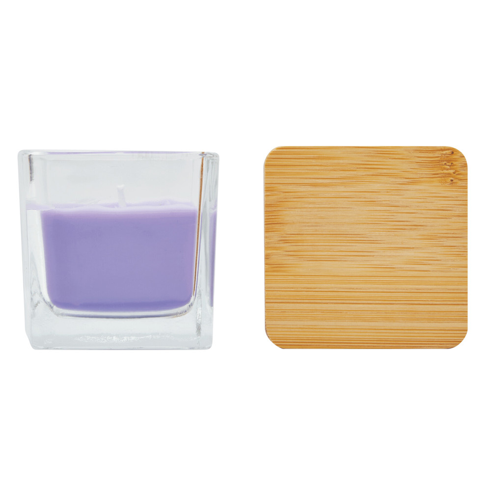 Duftkerze GLOW: in quadratischem Glas, farbiges Wachs mit Vanille-Duft, abnehmbarer Bambusdeckel mit Silikon-Dichtring, Brenndauer ca. 8 Stunden, in Box