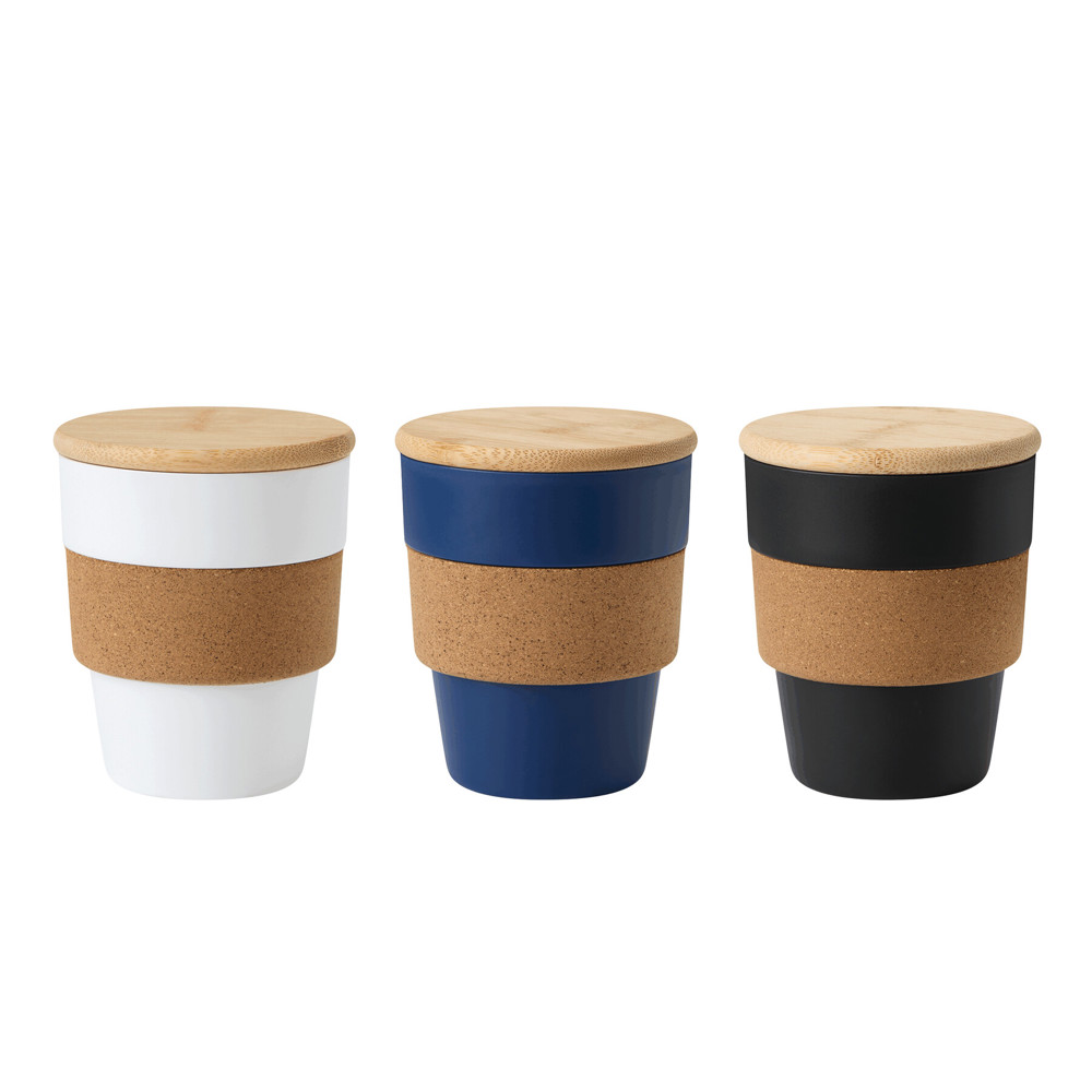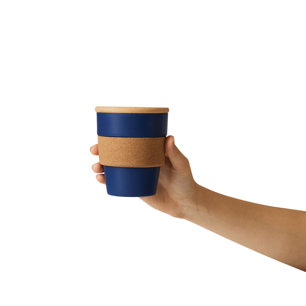 Trinkbecher TRAVEL GRIP, einwandig: aus Kunststoff, Grifffläche aus Kork, abnehmbarer Bambusdeckel mit Silikon-Dichtring, Füllmenge ca. 350 ml, in Box