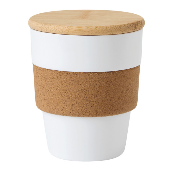 Trinkbecher TRAVEL GRIP, einwandig: aus Kunststoff, Grifffläche aus Kork, abnehmbarer Bambusdeckel mit Silikon-Dichtring, Füllmenge ca. 350 ml, in Box
