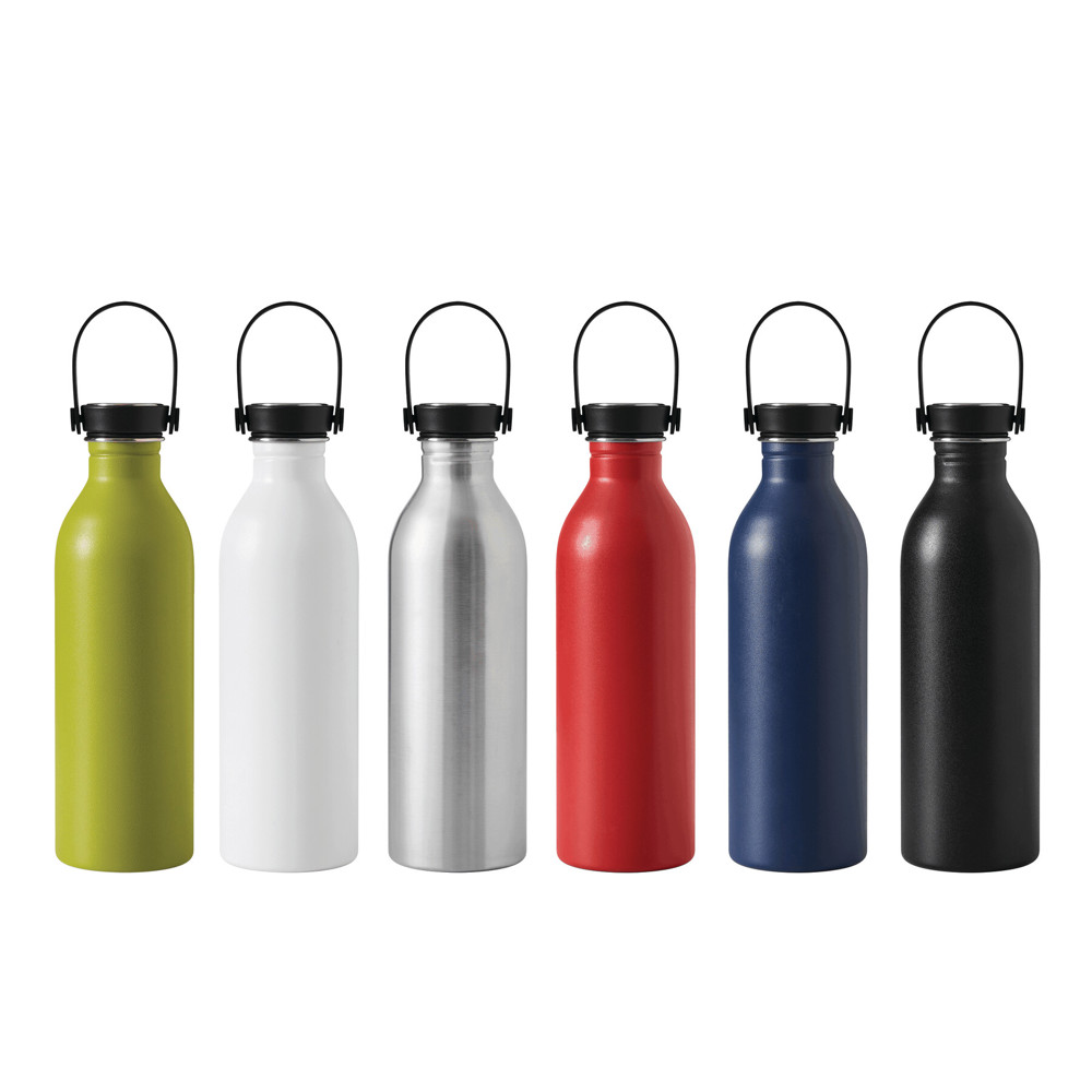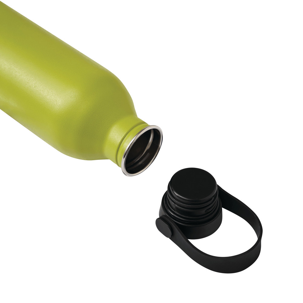 Isolierflasche GET REFRESH, einwandig: aus Edelstahl, matte Pulverlackierung, schwarzer Kunststoff-Deckel mit sicherem Schraubverschluss, Silikon-Dichtring und Silikon-Trageschlaufe, obere Deckelfläche aus Edelstahl, Füllmenge ca. 550 ml, hält ca. 2 Stunden warm und bis zu 4 Stunden kalt