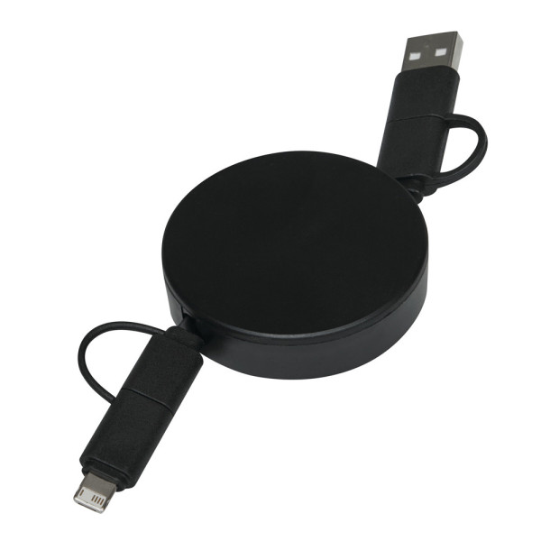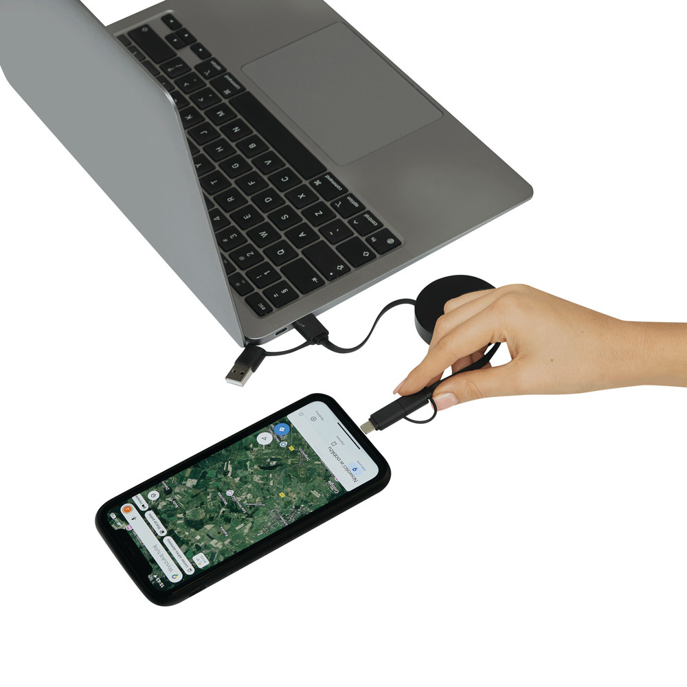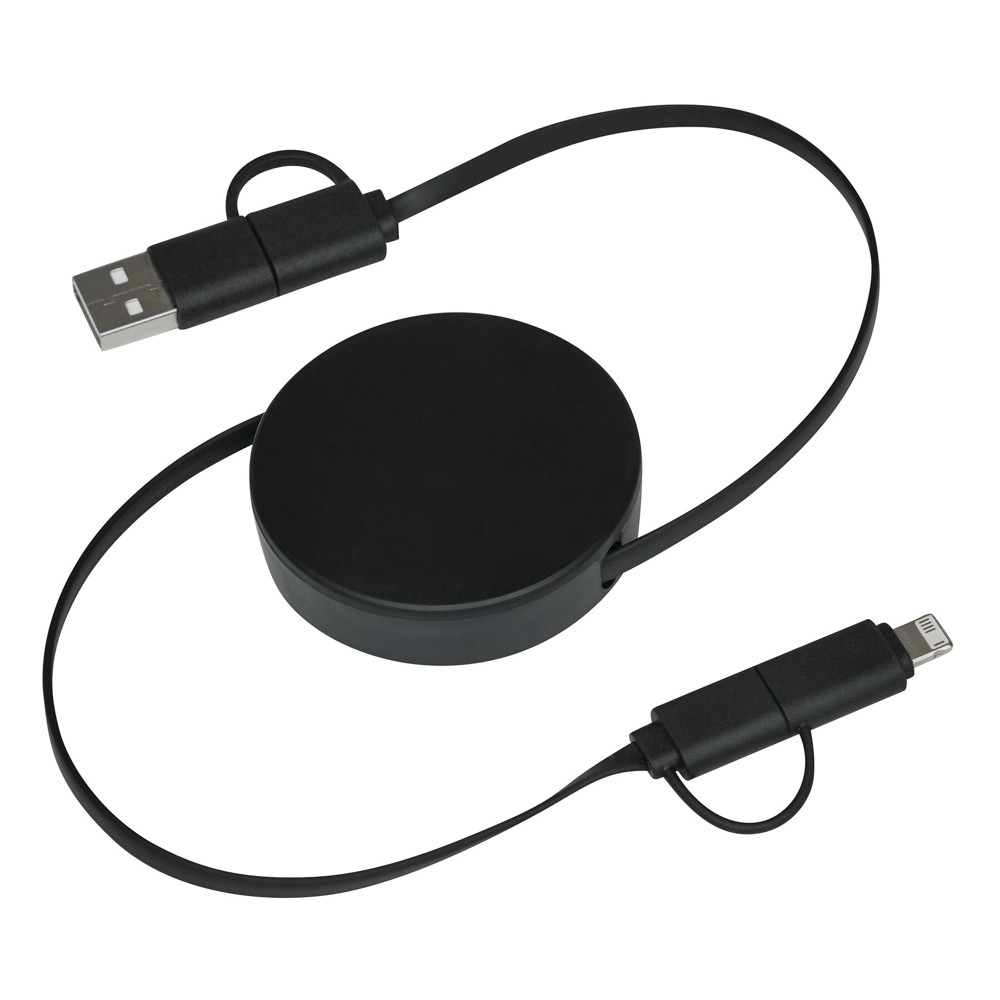 Lade- und Datenkabel TRANSFER ROUND, aufrollbar (Länge: ca. 92 cm): zum Aufladen von Smartphones, USB-betriebenen Geräten und Laptops (65 W Leistungsübertragung) sowie zum Übertragen von Daten, inkl. 2 Ladesteckern (USB Typ C, Kombistecker Micro-USB/Lightning®), kombinierter USB Typ A / Typ C Eingangsstecker, in Box