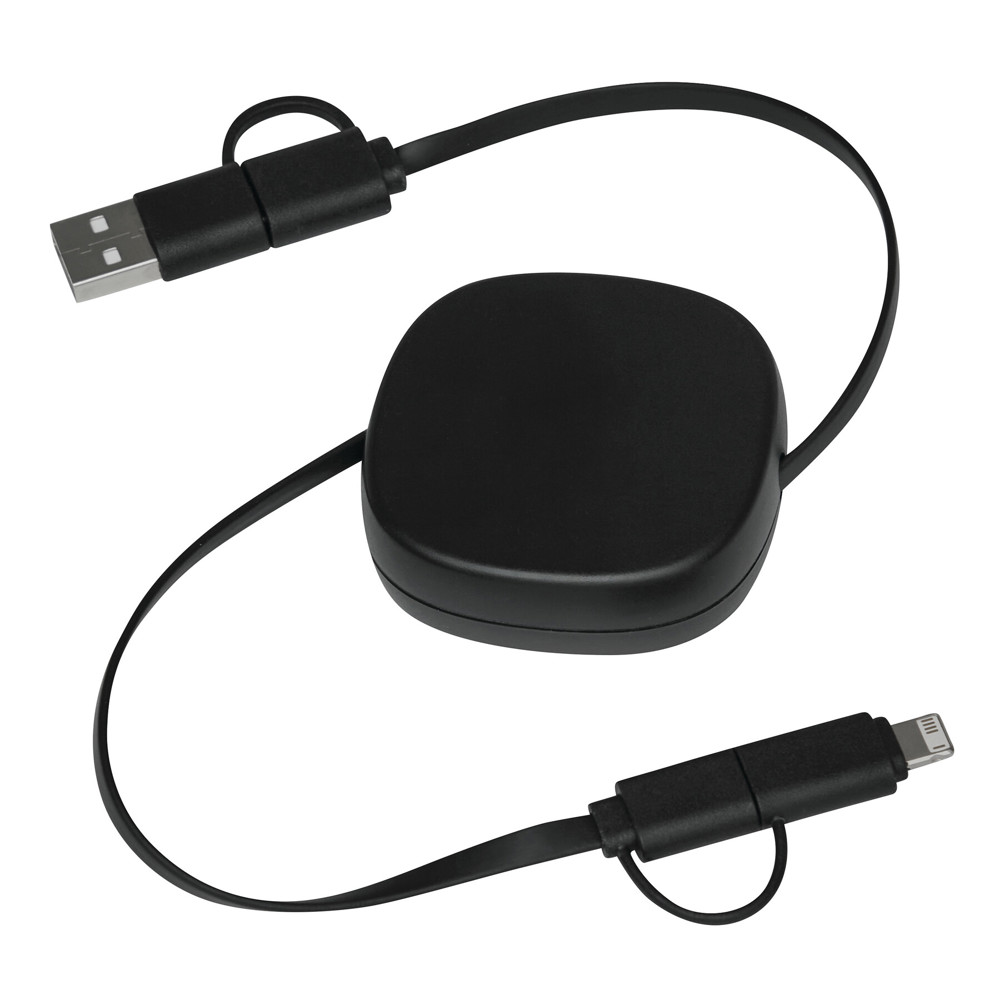 Lade- und Datenkabel TRANSFER SQUARE, aufrollbar (Länge: ca. 92 cm): zum Aufladen von Smartphones, USB-betriebenen Geräten und Laptops (65 W Leistungsübertragung) sowie zum Übertragen von Daten, inkl. 2 Ladesteckern (USB Typ C, Kombistecker Micro-USB/Lightning®), kombinierter USB Typ A / Typ C Eingangsstecker, in Box