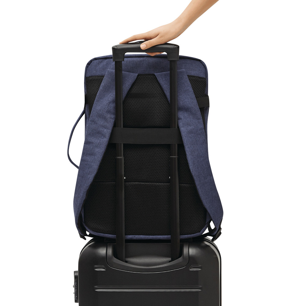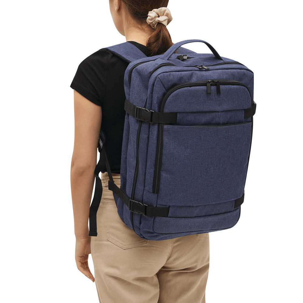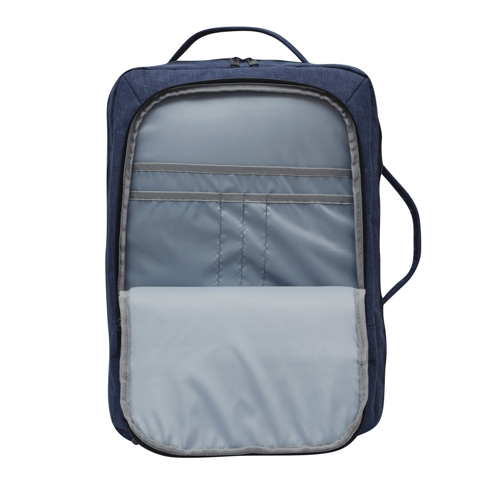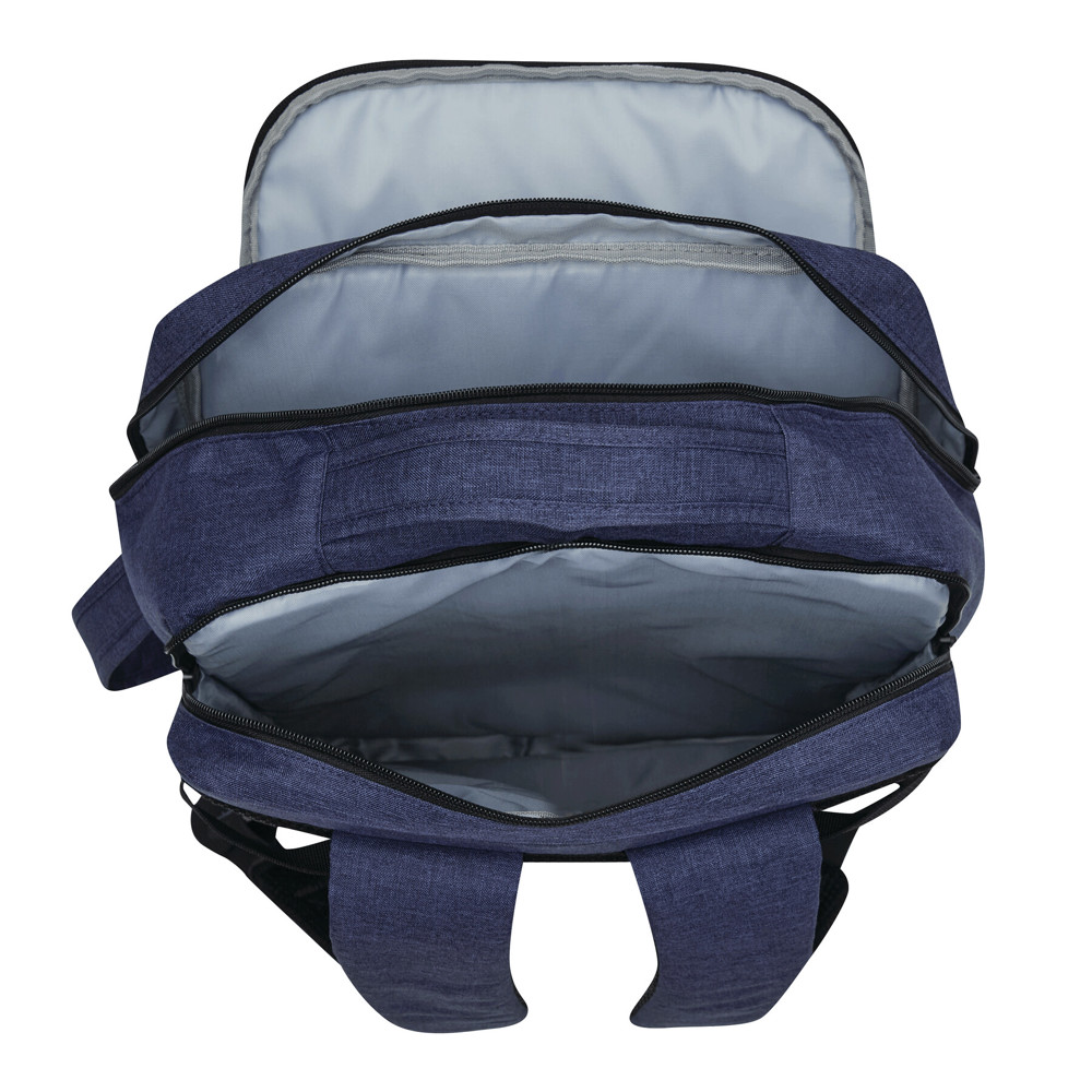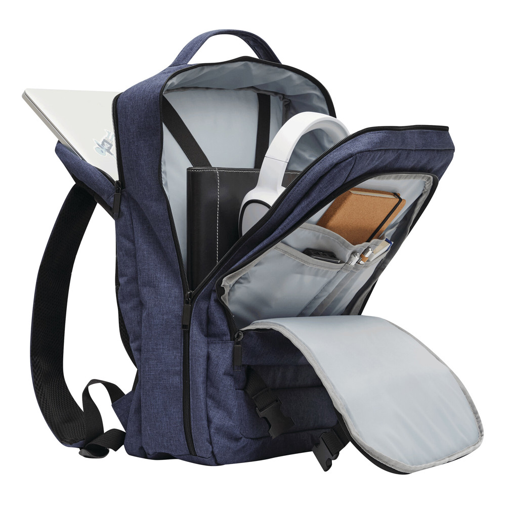 Rucksack STEWARD: 2 Reißverschluss-Vorfächer, eins davon mit Organizer (3 Steckfächer, 2 Stifteschlaufen), 1 großes gepolstertes Reißverschluss-Hauptfach mit Packgurt, 1 gepolstertes Reißverschluss-Laptopfach, jeweils 1 verstärkter Top- und Seitengriff, gepolsterte Schultergurte in ergonomischer Form und gepolsterter Rückenbereich, Gurt als Reporterfunktion auf der Rückseite, seitlich je 2 Kompressionsgurte mit Schnappverschluss