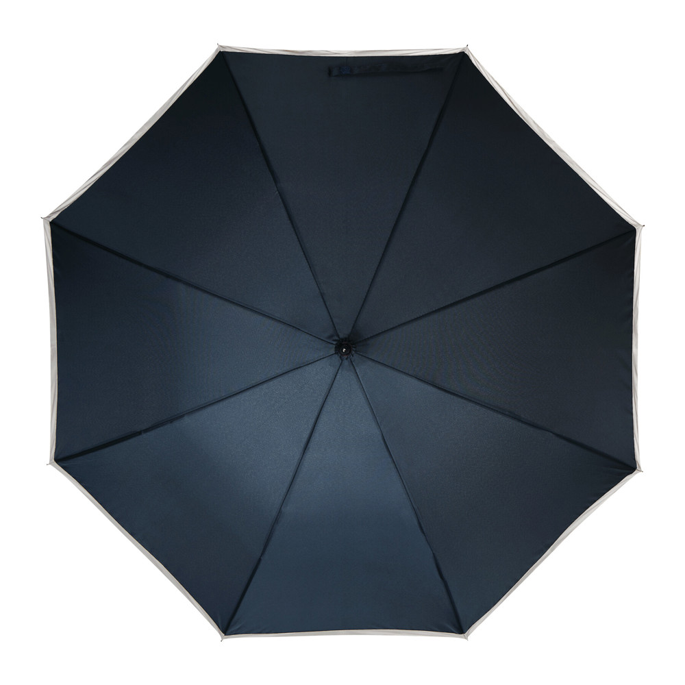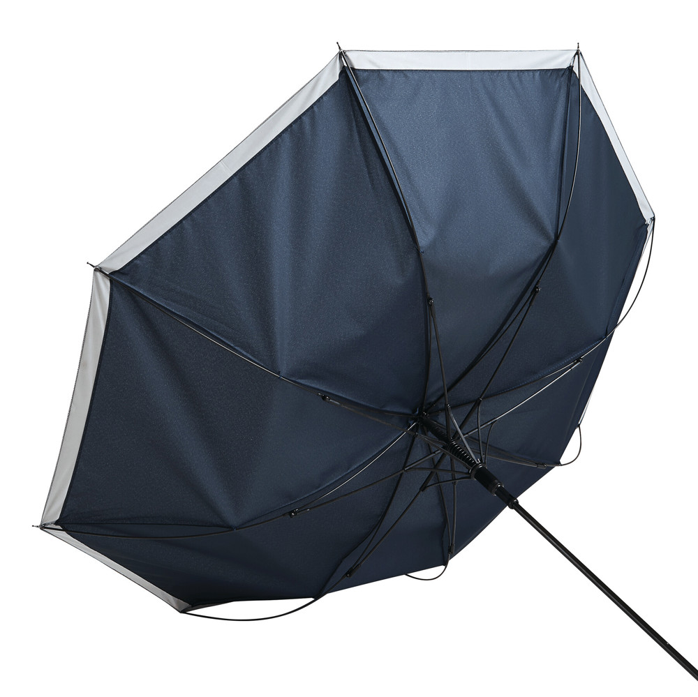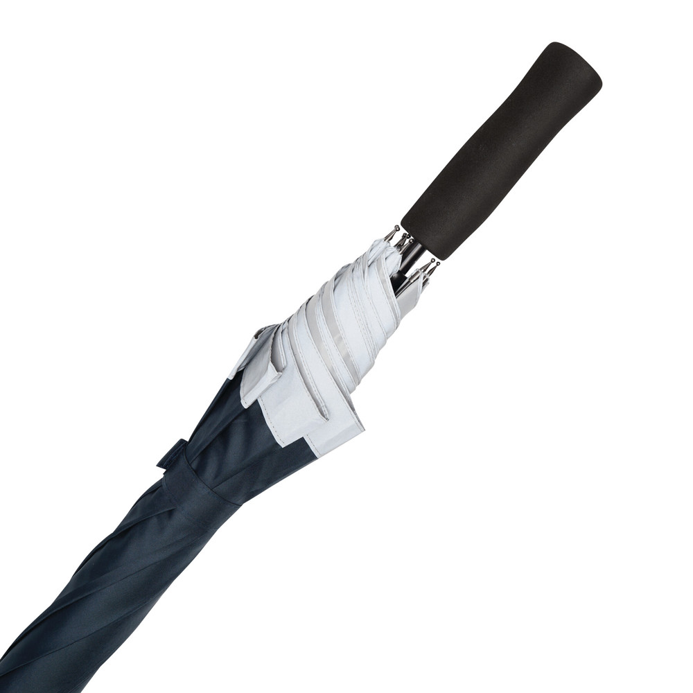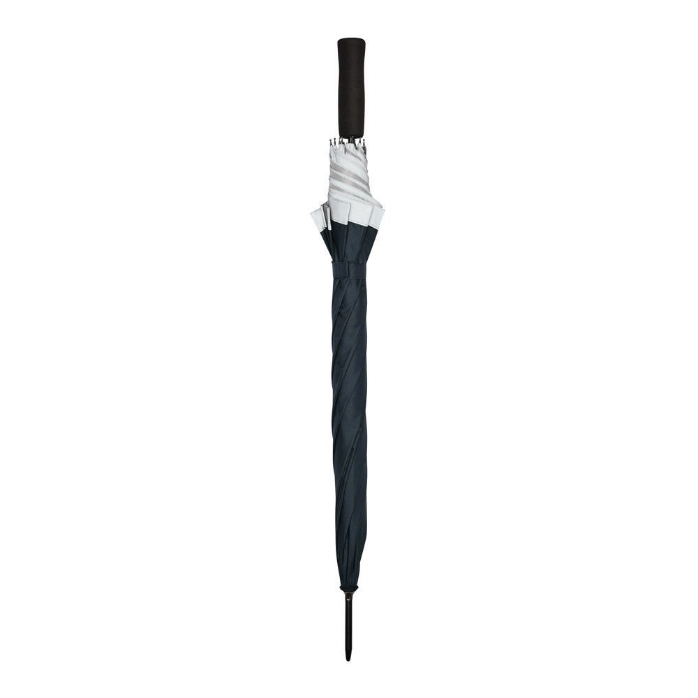 Automatischer Stockschirm CALIMA: Metallstock, Fiberglasspeichen, Metalltips, EVA-Griff, Polyester-Pongee-Bespannung aus recycelten Kunststoffen / rPET, mit silberfarbener, reflektierender Umrandung, Schließband mit Klettverschluss