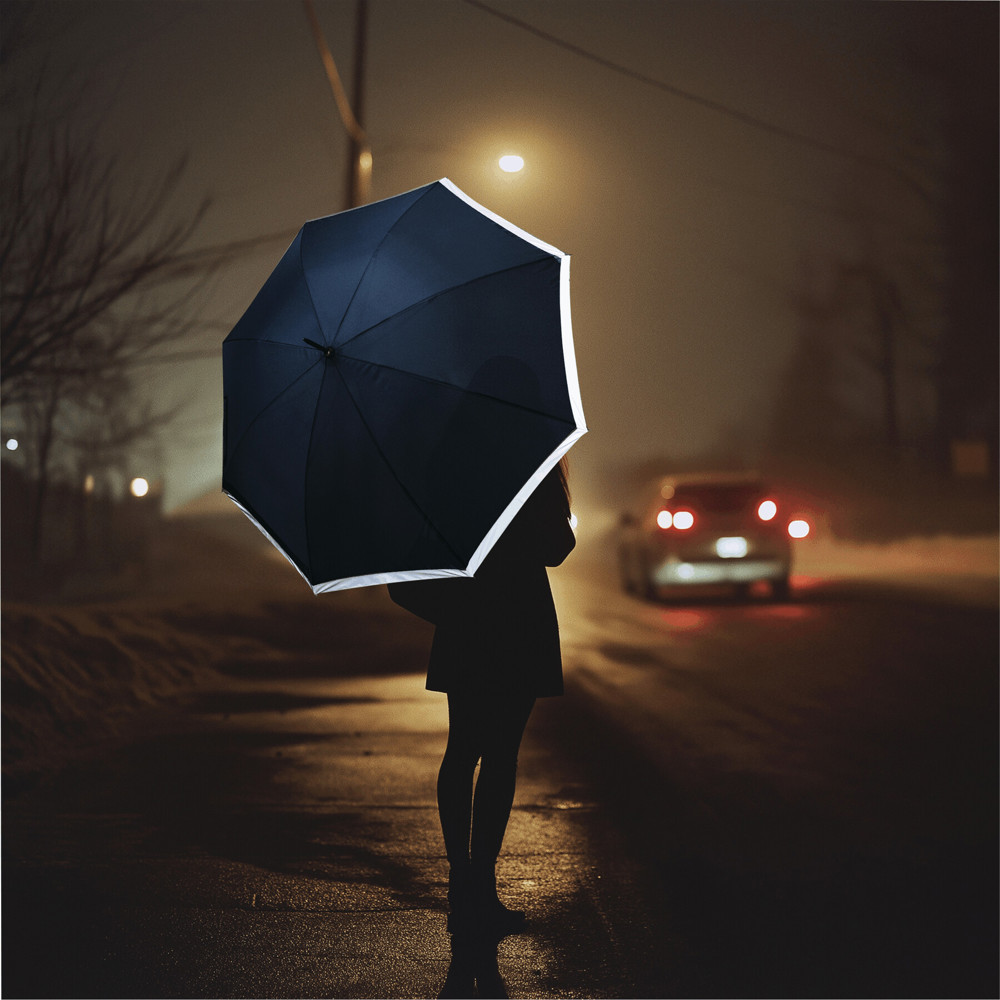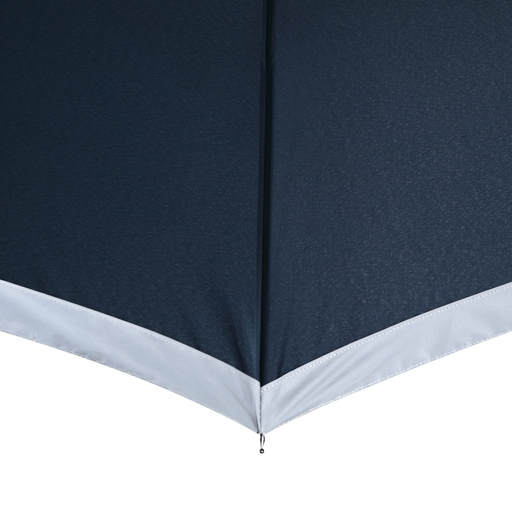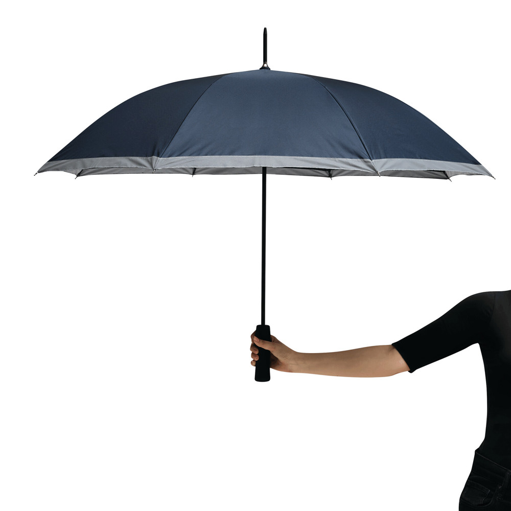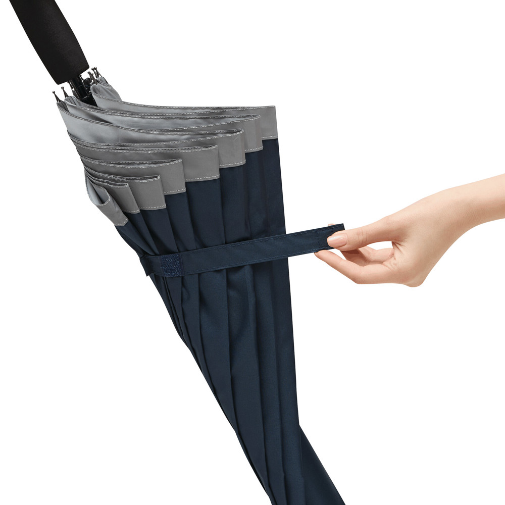 Automatischer Stockschirm CALIMA: Metallstock, Fiberglasspeichen, Metalltips, EVA-Griff, Polyester-Pongee-Bespannung aus recycelten Kunststoffen / rPET, mit silberfarbener, reflektierender Umrandung, Schließband mit Klettverschluss