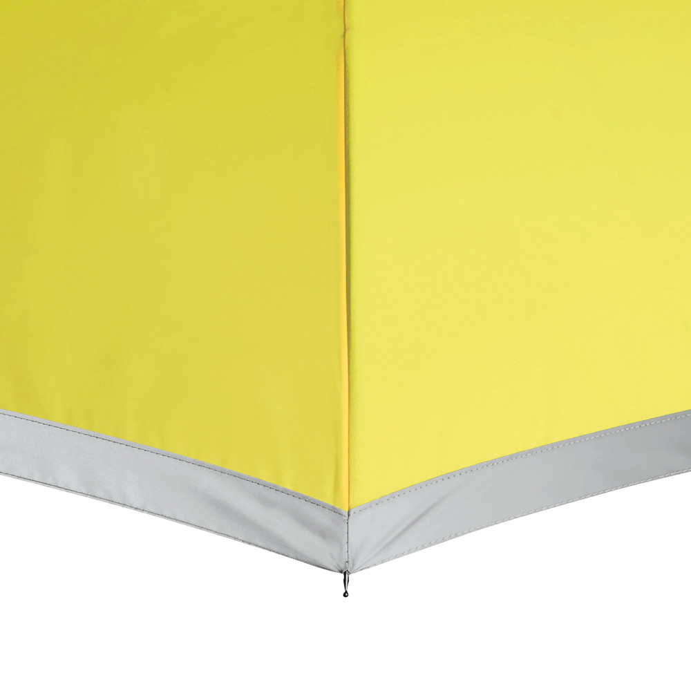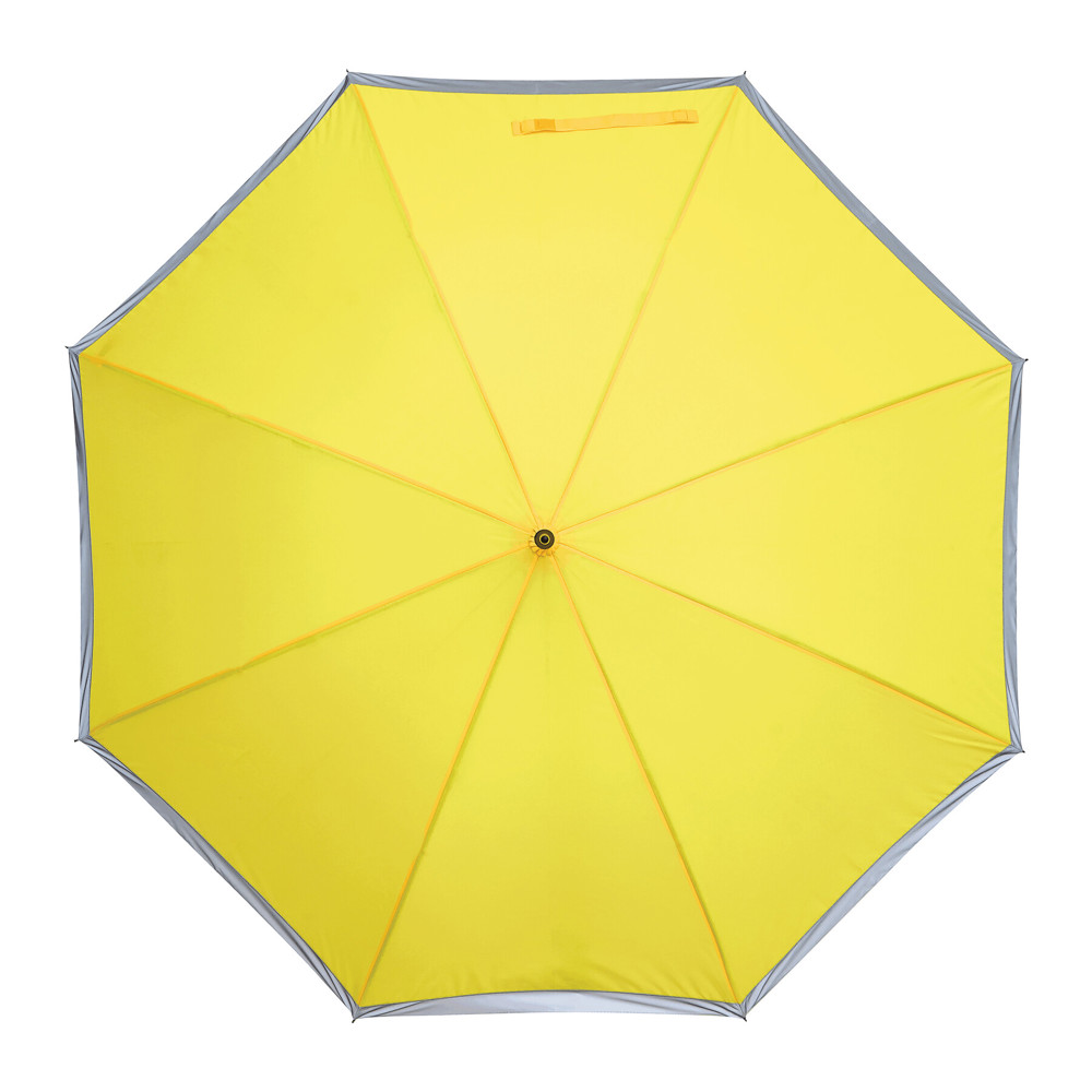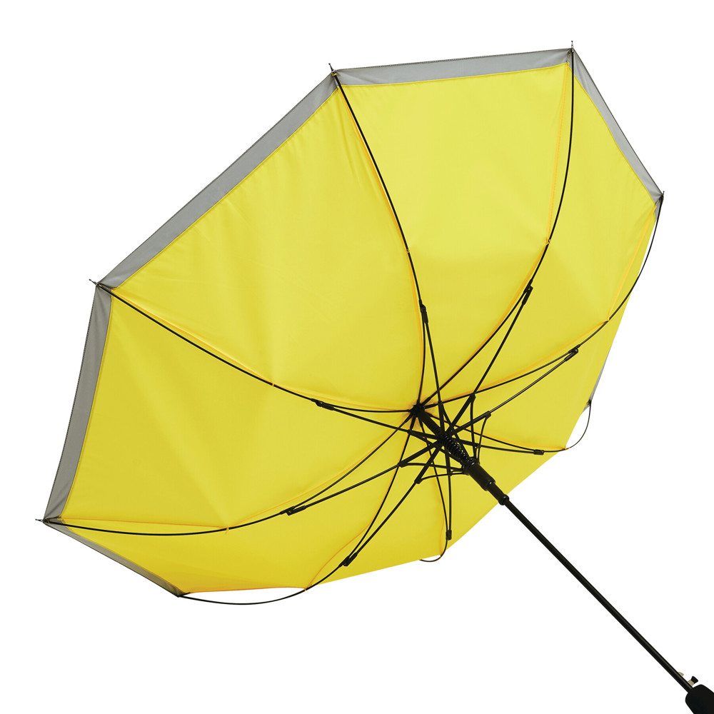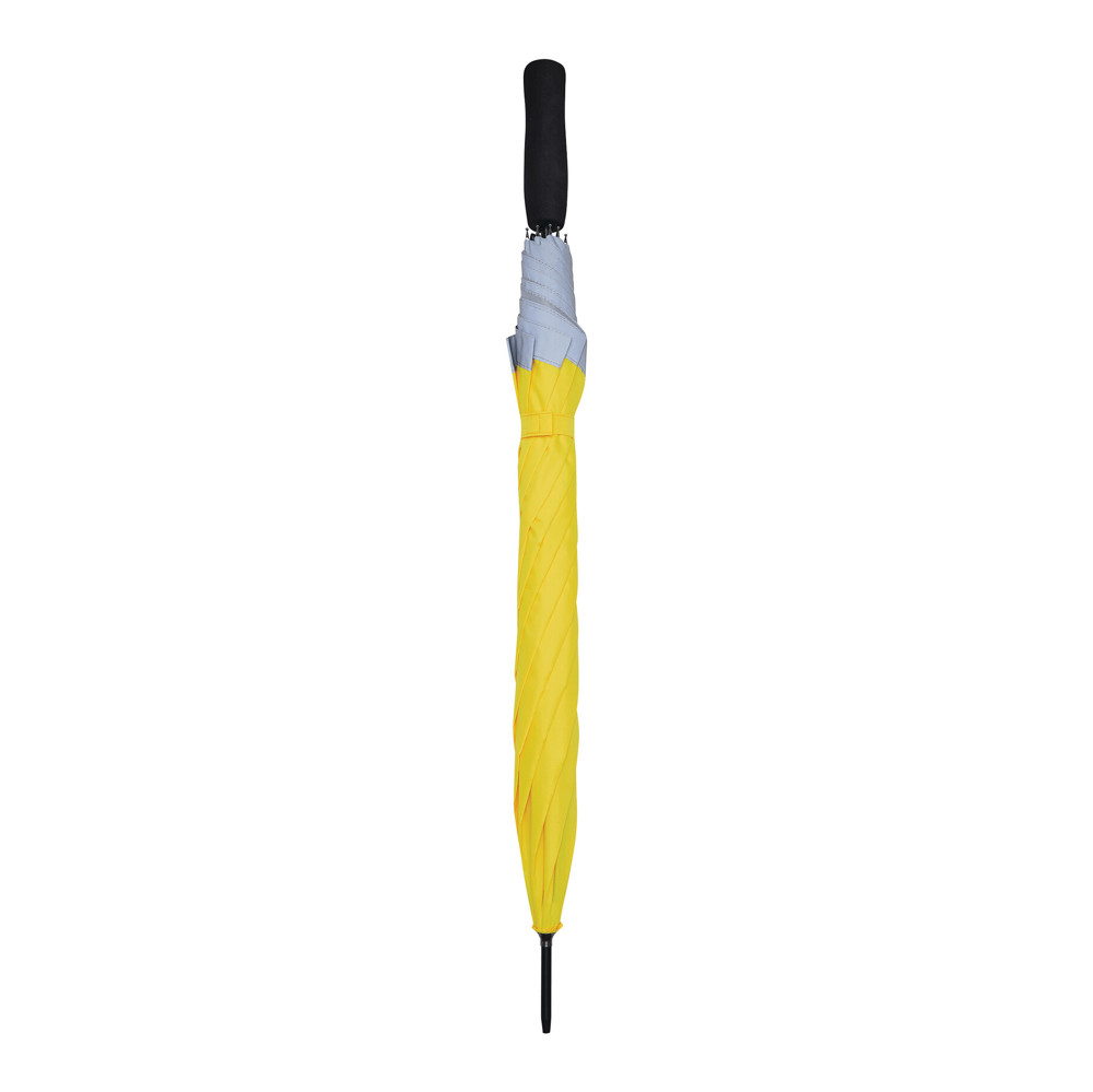 Automatischer Stockschirm CALIMA: Metallstock, Fiberglasspeichen, Metalltips, EVA-Griff, Polyester-Pongee-Bespannung aus recycelten Kunststoffen / rPET, mit silberfarbener, reflektierender Umrandung, Schließband mit Klettverschluss
