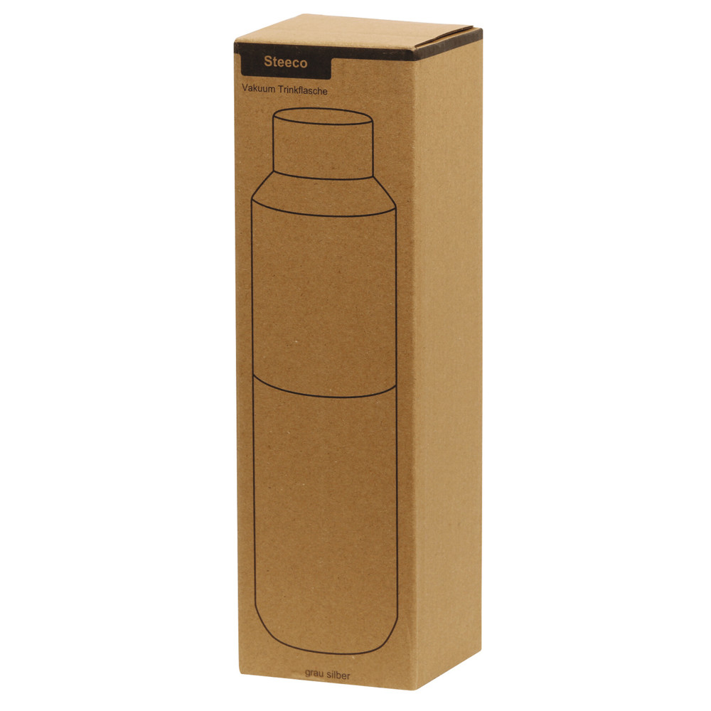 Vakuum-Isolierflasche STEECO, doppelwandig: innen aus recyceltem Edelstahl und außen aus Edelstahl, Deckel mit sicherem Schraubverschluss und Silikon-Dichtring, beschichteter Boden für gute Oberflächenhaftung, Füllmenge ca. 600 ml, hält ca. 8 Stunden warm und bis zu 12 Stunden kalt, in Box