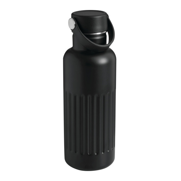 Vakuum-Isolierflasche WAVE TRAIL, doppelwandig: innen aus recyceltem Edelstahl und außen aus Edelstahl, schwarzer Kunststoff-Deckel mit sicherem Schraubverschluss, Silikon-Dichtring und Kunststoff-Trageschlaufe, Füllmenge ca. 500 ml, hält ca. 8 Stunden warm und bis zu 12 Stunden kalt, in Box