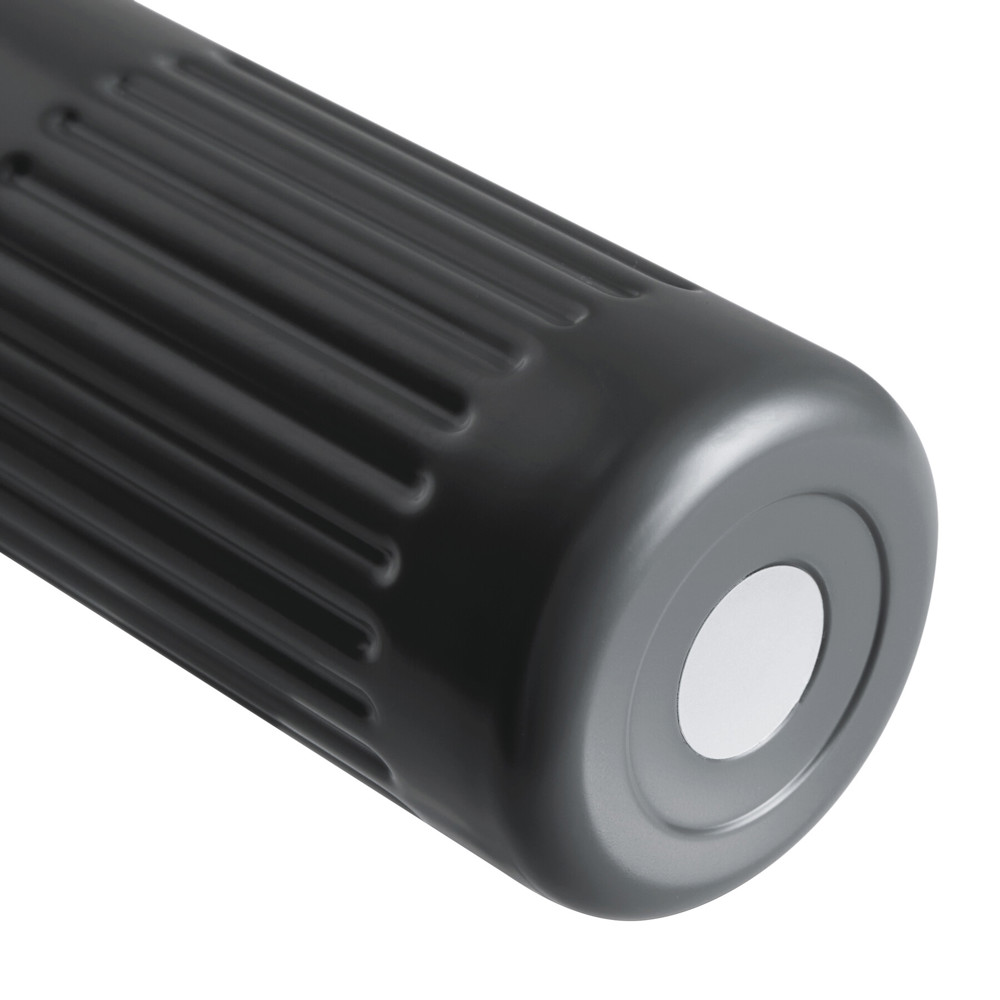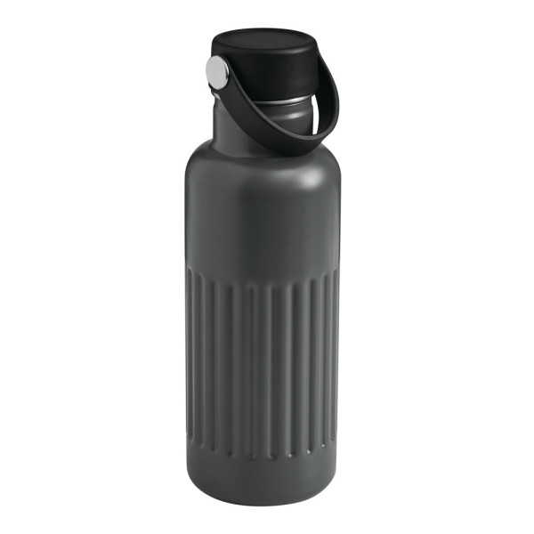 Vakuum-Isolierflasche WAVE TRAIL, doppelwandig: innen aus recyceltem Edelstahl und außen aus Edelstahl, schwarzer Kunststoff-Deckel mit sicherem Schraubverschluss, Silikon-Dichtring und Kunststoff-Trageschlaufe, Füllmenge ca. 500 ml, hält ca. 8 Stunden warm und bis zu 12 Stunden kalt, in Box
