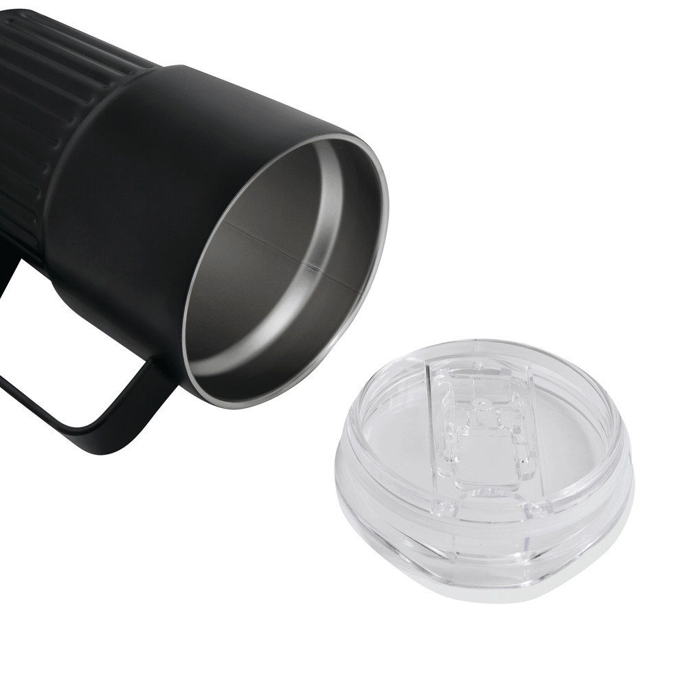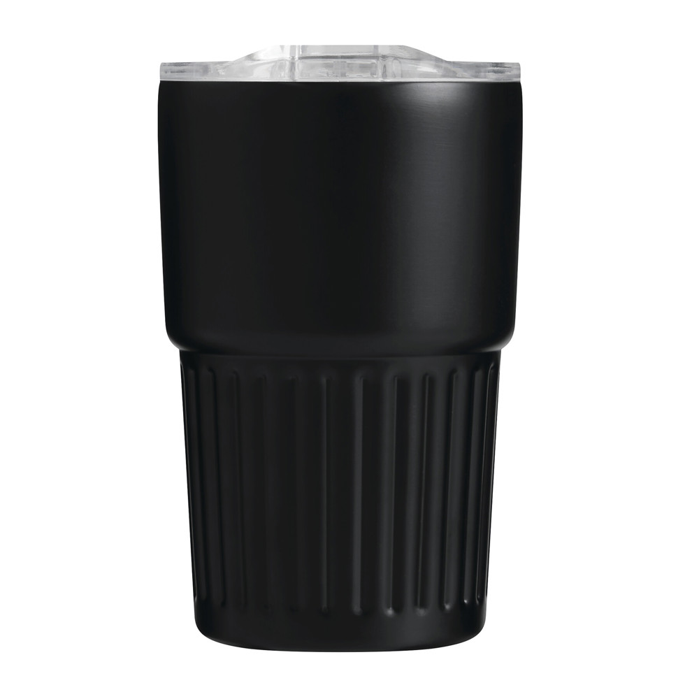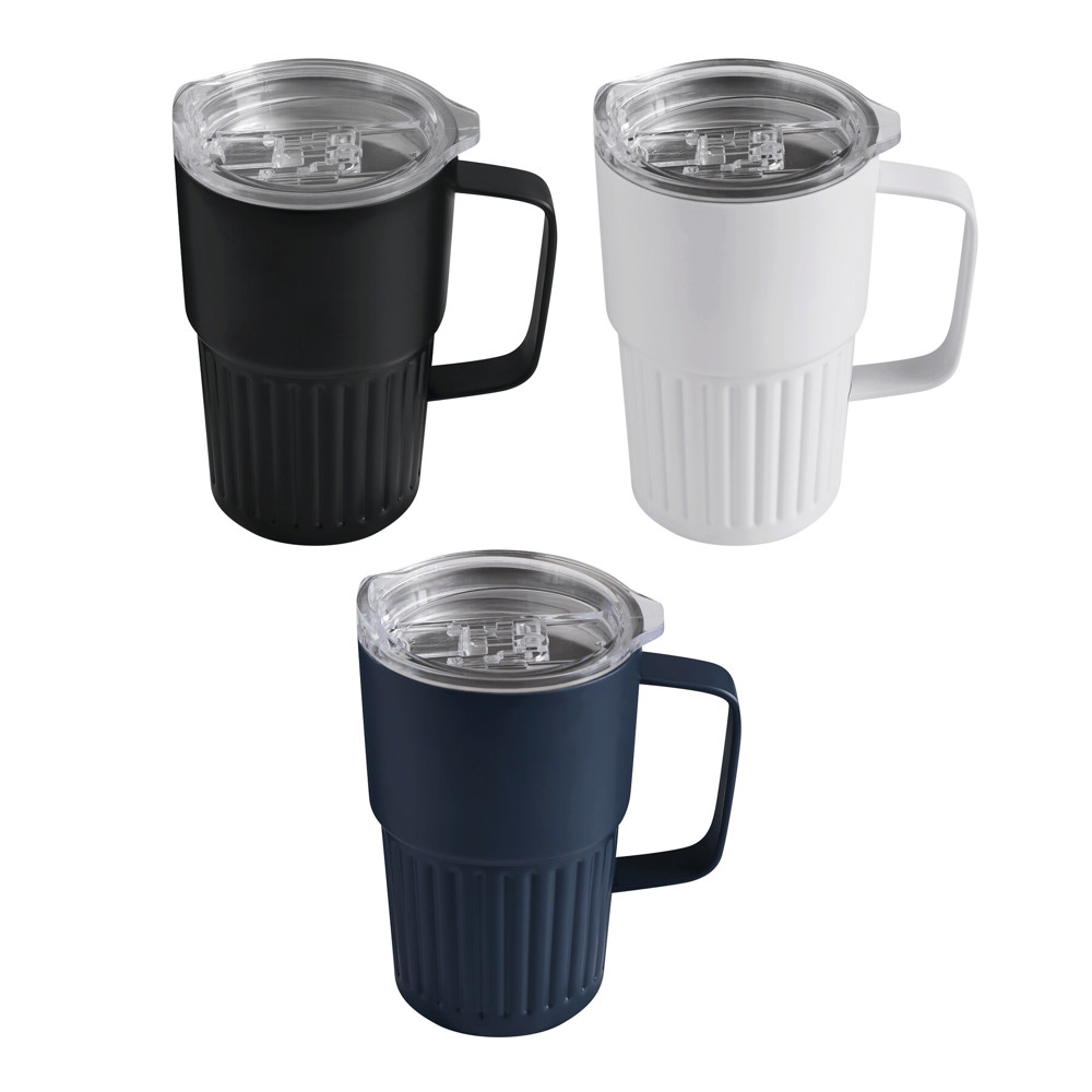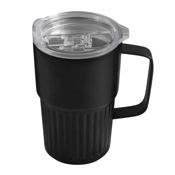 Vakuum-Isolierbecher WAVE HOLD, doppelwandig: innen aus recyceltem Edelstahl und außen aus Edelstahl, mit praktischem Griff, transparenter Kunststoff-Deckel mit Silikon-Dichtring und integrierter Trinköffnung zum Aufschieben, Füllmenge ca. 450 ml, hält ca. 4 Stunden warm und bis zu 8 Stunden kalt, in Box