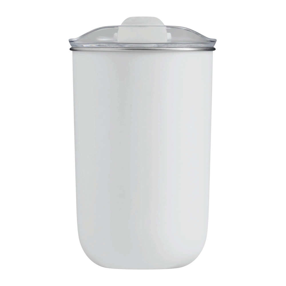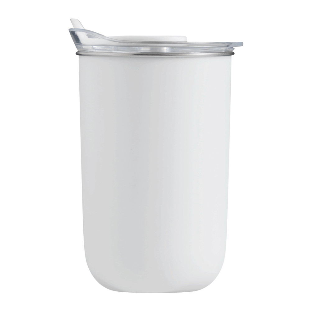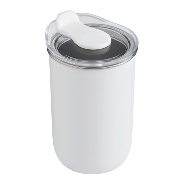 Trinkbecher SIP, doppelwandig: innen aus Edelstahl und außen aus Kunststoff, transparenter Kunststoff-Deckel mit Silikon-Dichtring und integrierter Trinköffnung (mit Silikon-Abdeckung), Füllmenge ca. 350 ml, hält ca. 2 Stunden warm und bis zu 4 Stunden kalt, nicht geeignet für Heißgetränke, in Box