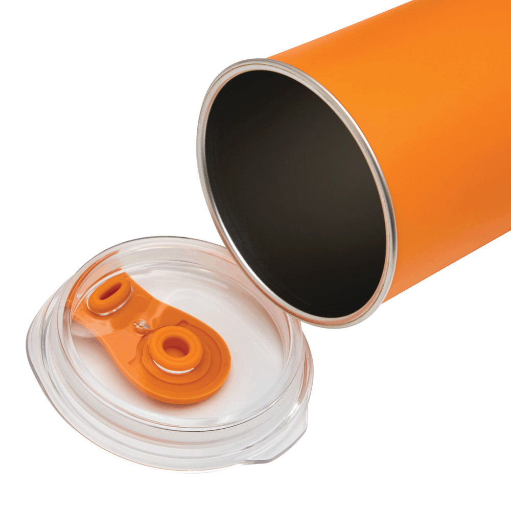 Trinkbecher SIP, doppelwandig: innen aus Edelstahl und außen aus Kunststoff, transparenter Kunststoff-Deckel mit Silikon-Dichtring und integrierter Trinköffnung (mit Silikon-Abdeckung), Füllmenge ca. 350 ml, hält ca. 2 Stunden warm und bis zu 4 Stunden kalt, nicht geeignet für Heißgetränke, in Box