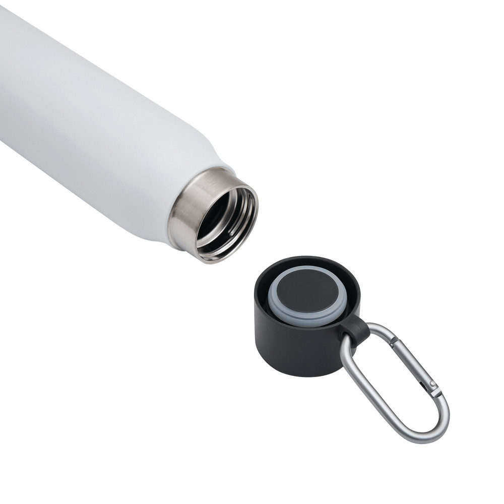 Vakuum-Isolierflasche ALPINE PEAK, doppelwandig: innen aus recyceltem Edelstahl und außen aus Edelstahl, schwarzer Kunststoff-Deckel mit sicherem Schraubverschluss, Silikon-Dichtring und Karabinerhaken (der Karabiner ist NICHT als Sicherung beim Klettern geeignet), Füllmenge ca. 550 ml, hält ca. 8 Stunden warm und bis zu 12 Stunden kalt, in Box