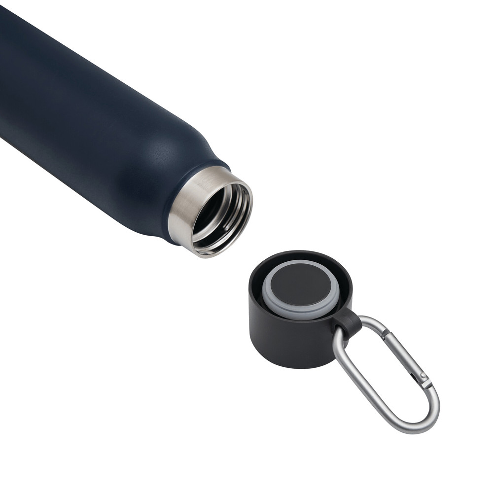 Vakuum-Isolierflasche ALPINE PEAK, doppelwandig: innen aus recyceltem Edelstahl und außen aus Edelstahl, schwarzer Kunststoff-Deckel mit sicherem Schraubverschluss, Silikon-Dichtring und Karabinerhaken (der Karabiner ist NICHT als Sicherung beim Klettern geeignet), Füllmenge ca. 550 ml, hält ca. 8 Stunden warm und bis zu 12 Stunden kalt, in Box