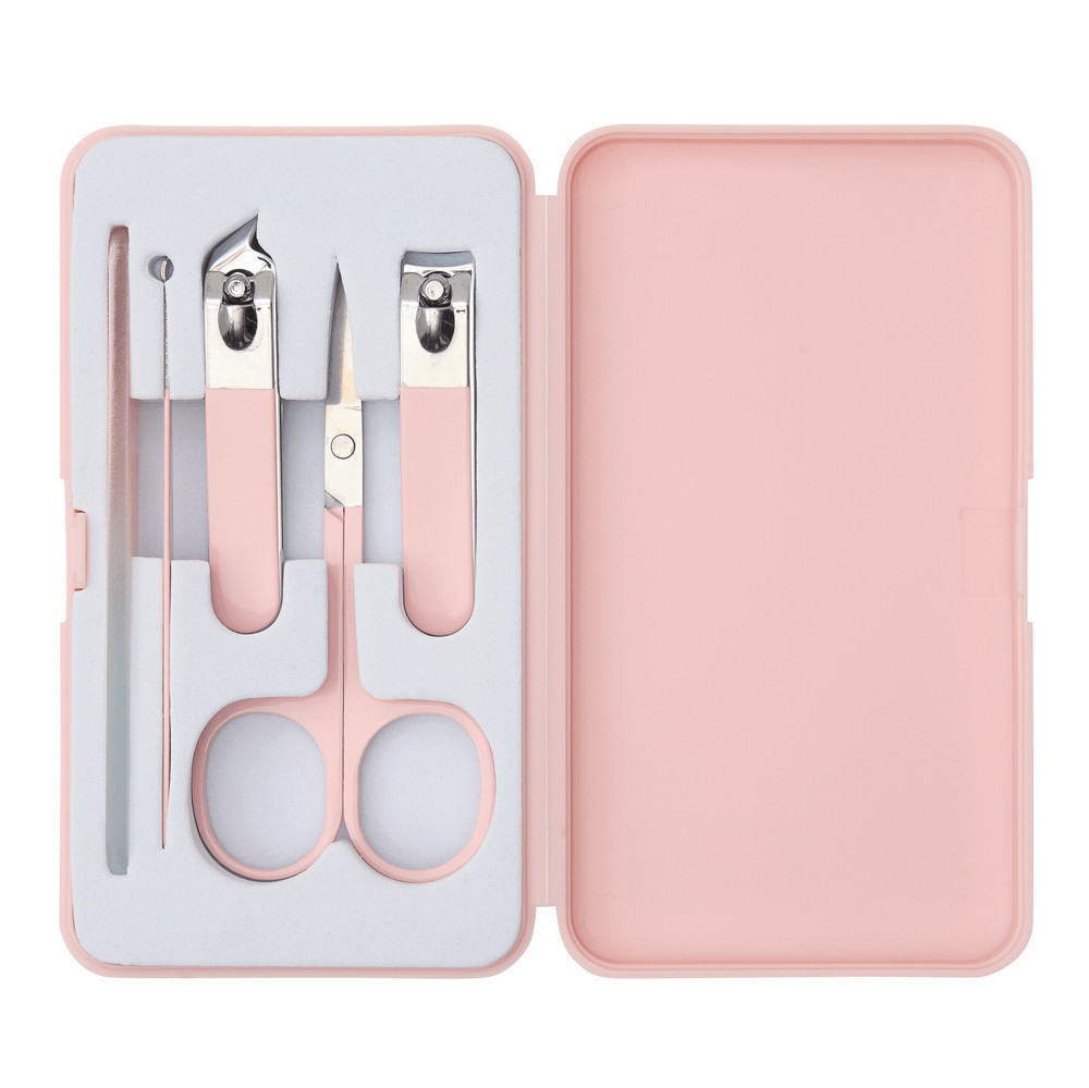 Maniküreset BOXED, 5-teilig: bestehend aus Glas-Nagelfeile, 2 Stahl-Nagelknipsern (1 mit schräger Spitze), Edelstahl-Nagelschere und -Ohrenstäbchen, im Kunststoff-Etui, in Box