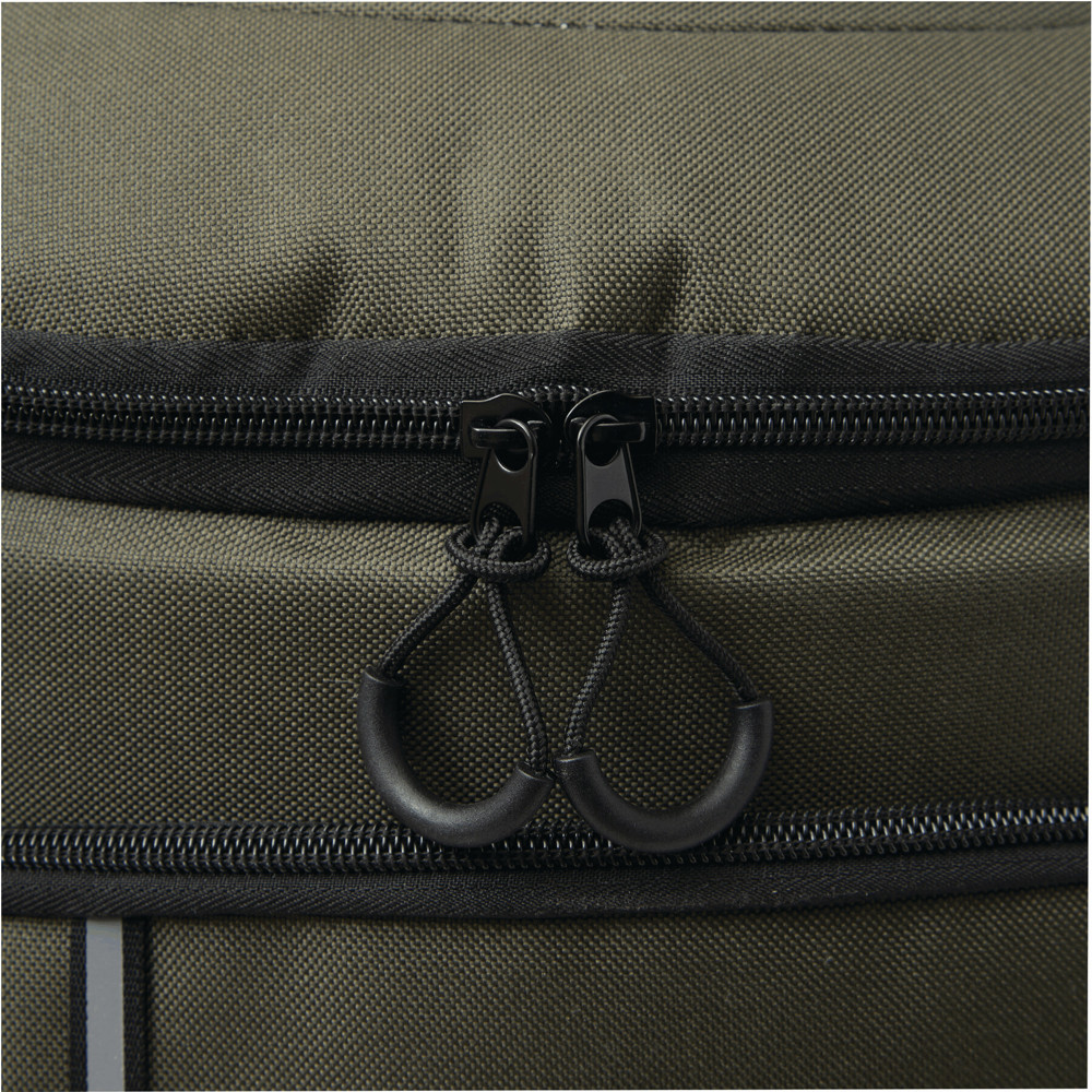 Kühlrucksack YUKON: 1 großes isoliertes Reißverschluss-Hauptfach mit PEVA-Futter, 1 Reißverschluss-Vorfach mit Reißverschluss-Netzfach, 1 vertikales Reißverschluss-Vorfach mit reflektierendem Streifen, 2 seitliche Netzfächer, 1 abnehmbarer Flaschenöffner aus Edelstahl, wasserabweisender Boden, verstellbare gepolsterte Schultergurte, Tragegriff