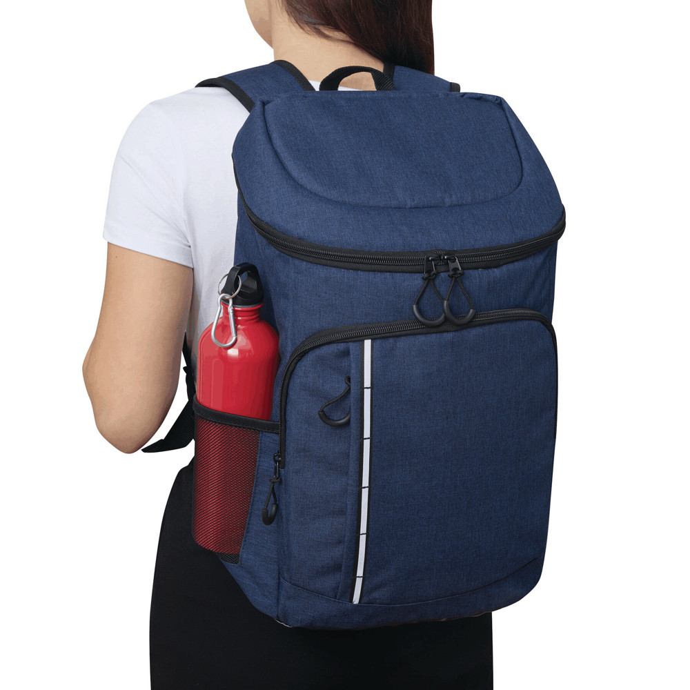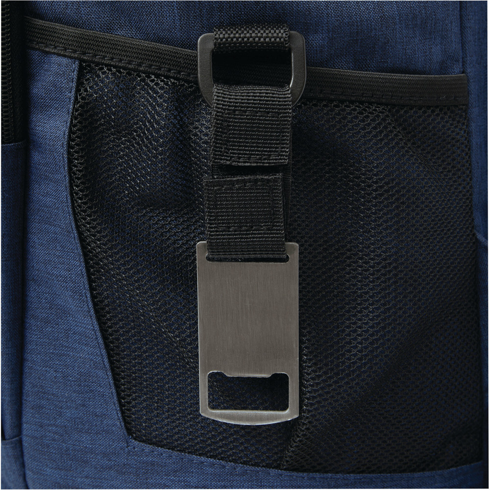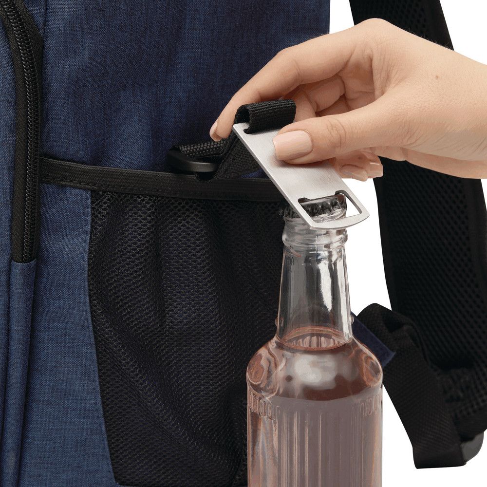 Kühlrucksack YUKON: 1 großes isoliertes Reißverschluss-Hauptfach mit PEVA-Futter, 1 Reißverschluss-Vorfach mit Reißverschluss-Netzfach, 1 vertikales Reißverschluss-Vorfach mit reflektierendem Streifen, 2 seitliche Netzfächer, 1 abnehmbarer Flaschenöffner aus Edelstahl, wasserabweisender Boden, verstellbare gepolsterte Schultergurte, Tragegriff