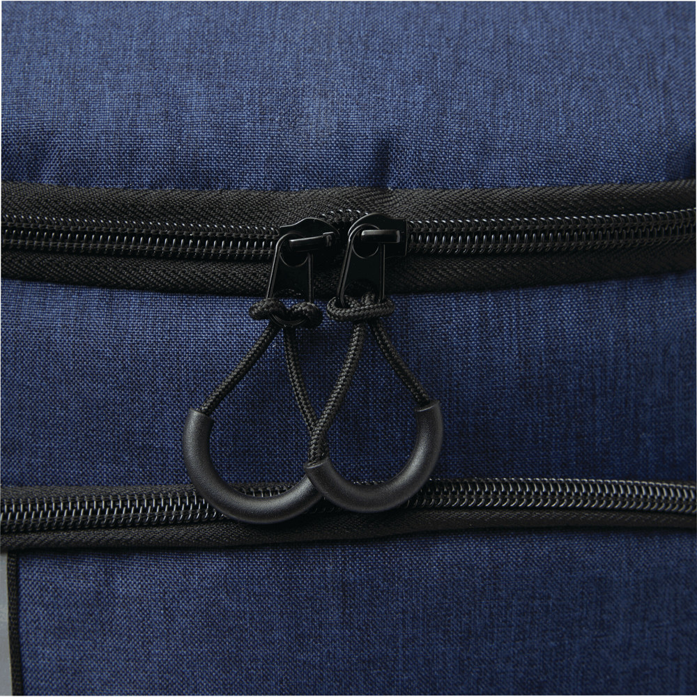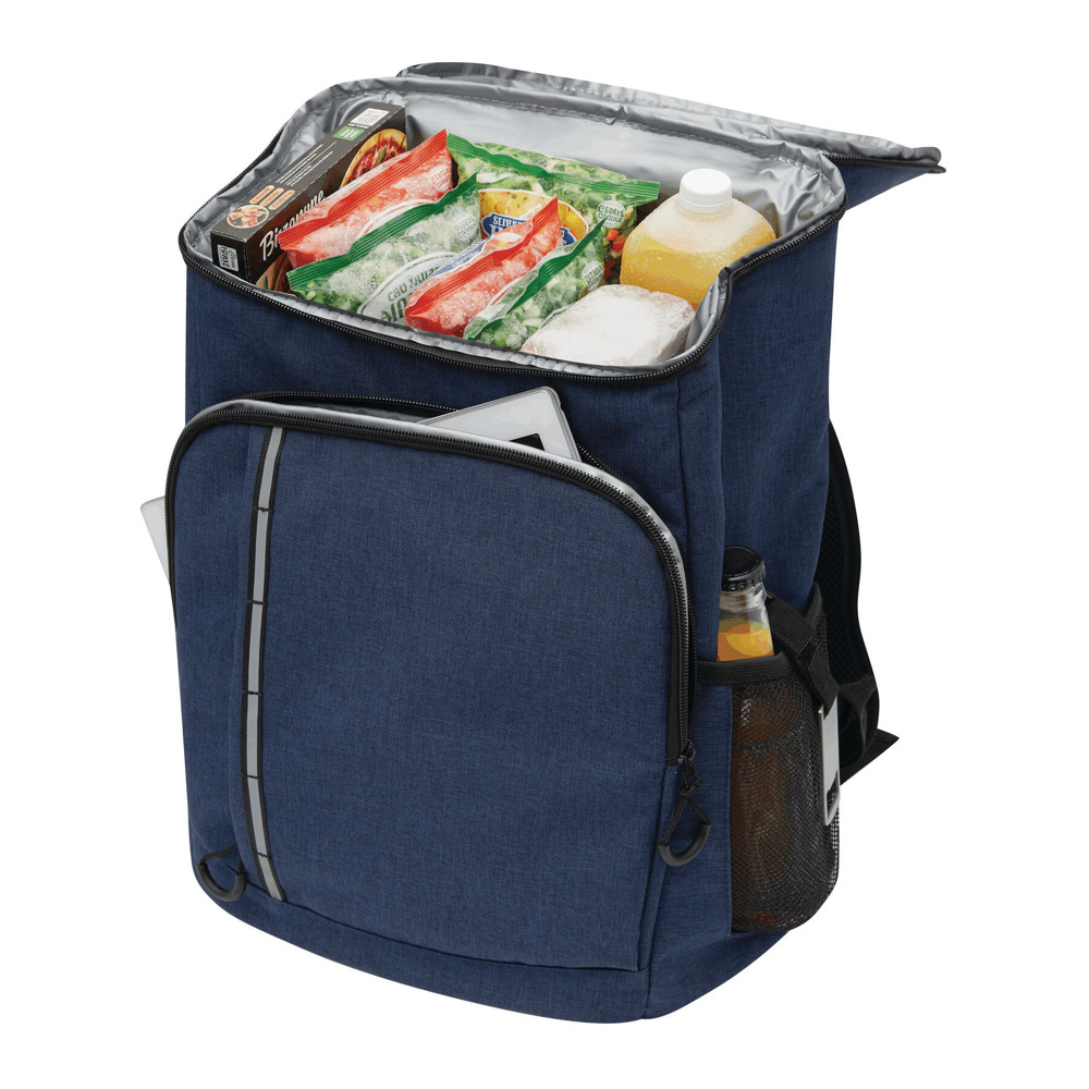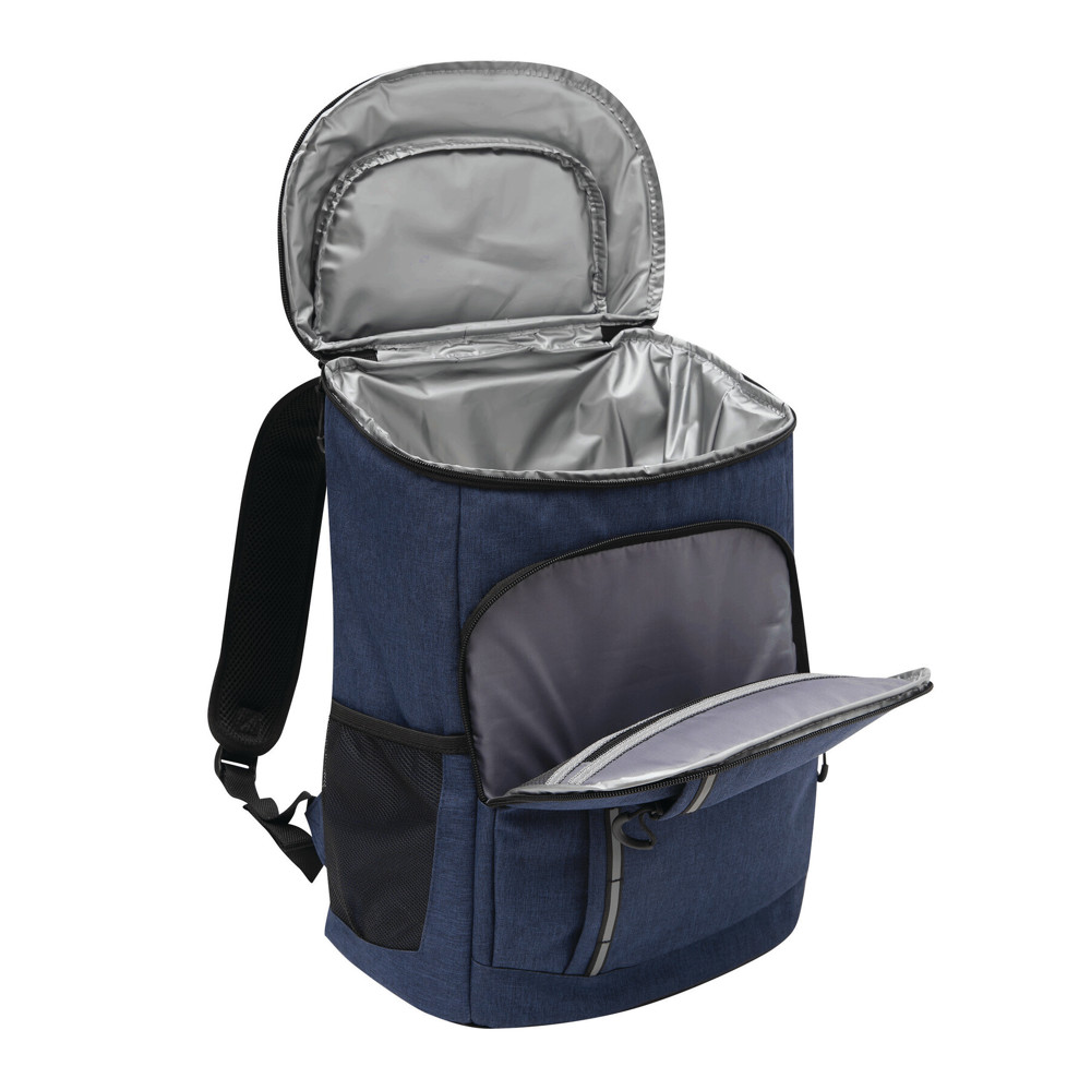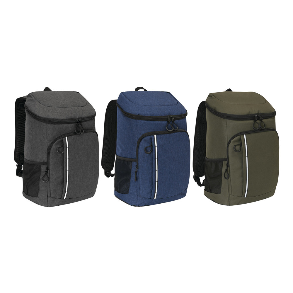Kühlrucksack YUKON: 1 großes isoliertes Reißverschluss-Hauptfach mit PEVA-Futter, 1 Reißverschluss-Vorfach mit Reißverschluss-Netzfach, 1 vertikales Reißverschluss-Vorfach mit reflektierendem Streifen, 2 seitliche Netzfächer, 1 abnehmbarer Flaschenöffner aus Edelstahl, wasserabweisender Boden, verstellbare gepolsterte Schultergurte, Tragegriff