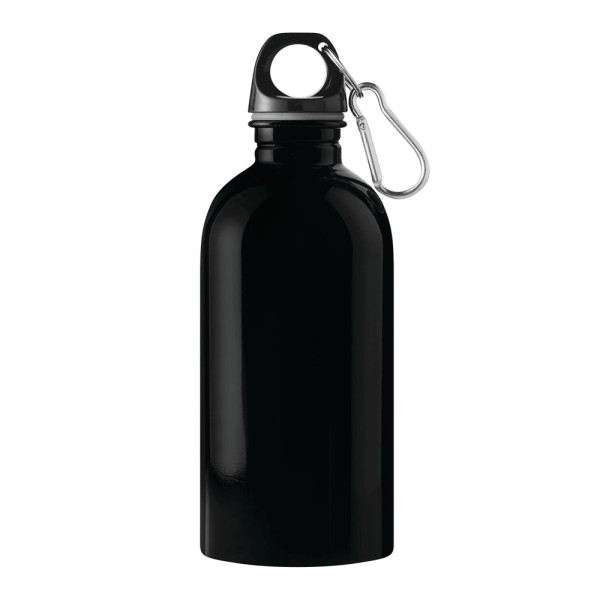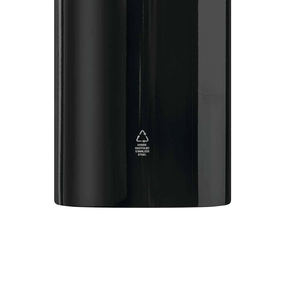 Trinkflasche SMALLTRANSIT, einwandig: aus recyceltem Edelstahl, schwarzer Kunststoff-Deckel mit sicherem Schraubverschluss, Silikon-Dichtring, Tragegriff, Schlüsselring und Karabinerhaken (der Karabiner ist NICHT als Sicherung beim Klettern geeignet), Füllmenge ca. 550 ml