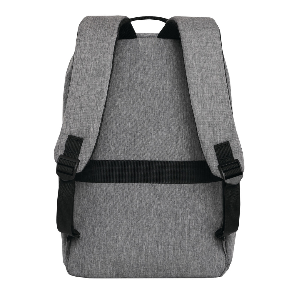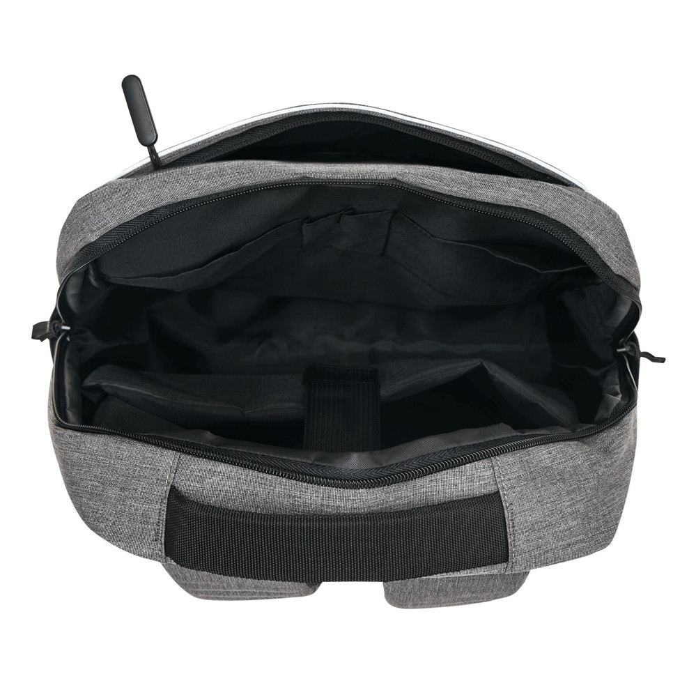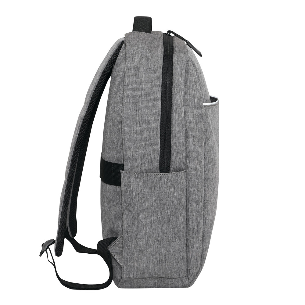 Rucksack GHENT: aus recyceltem Polyester (RPET), 1 Reißverschluss-Vorfach mit Reflektorstreifen, Reißverschluss-Hauptfach mit gepolstertem Innenfach für Laptop oder Tablet, Organizer mit 4 Steckfächern, 2 seitliche Einsteckfächer, gepolsterter Tragegriff, gepolsterte und verstellbare Schultergurte, Gurt als Reporterfunktion auf der Rückseite
