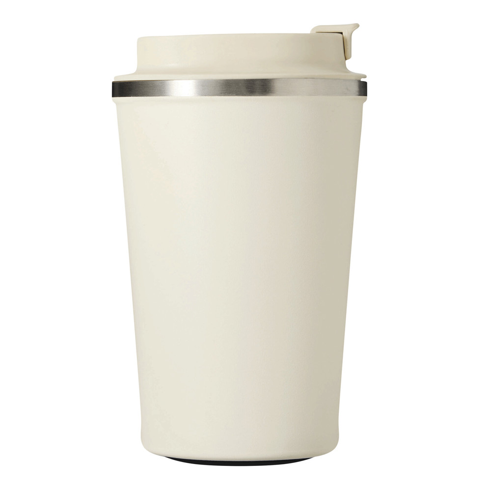Vakuum-Isolierbecher VELOMUG, doppelwandig: innen aus recyceltem Edelstahl und außen aus Edelstahl, farblich passender Kunststoff-Deckel mit sicherem Schraubverschluss, Silikon-Dichtring und integrierter Trinköffnung zum Aufklappen, gummierter Boden für gute Oberflächenhaftung, Füllmenge ca. 350 ml, hält ca. 8 Stunden warm und bis zu 12 Stunden kalt, in Box