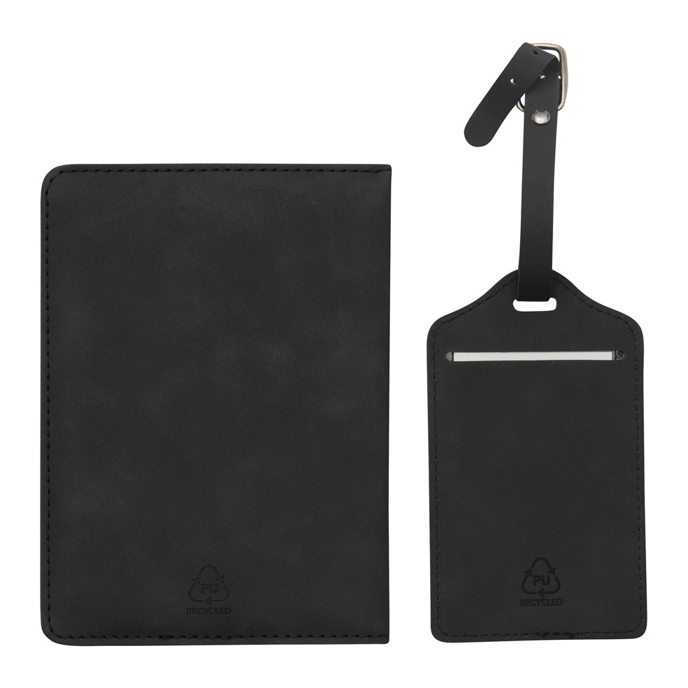 Reiseset VISA, 2-teilig: bestehend aus handlicher Reisepassbörse mit 4 Einsteckfächern für Geldkarten, 1 Fach für Bordkarten, 1 Fach für den Reisepass, mit Gummiband zum Verschließen und Kofferanhänger mit verdecktem Adressfeld und Anhängeband mit Schnalle, in Box