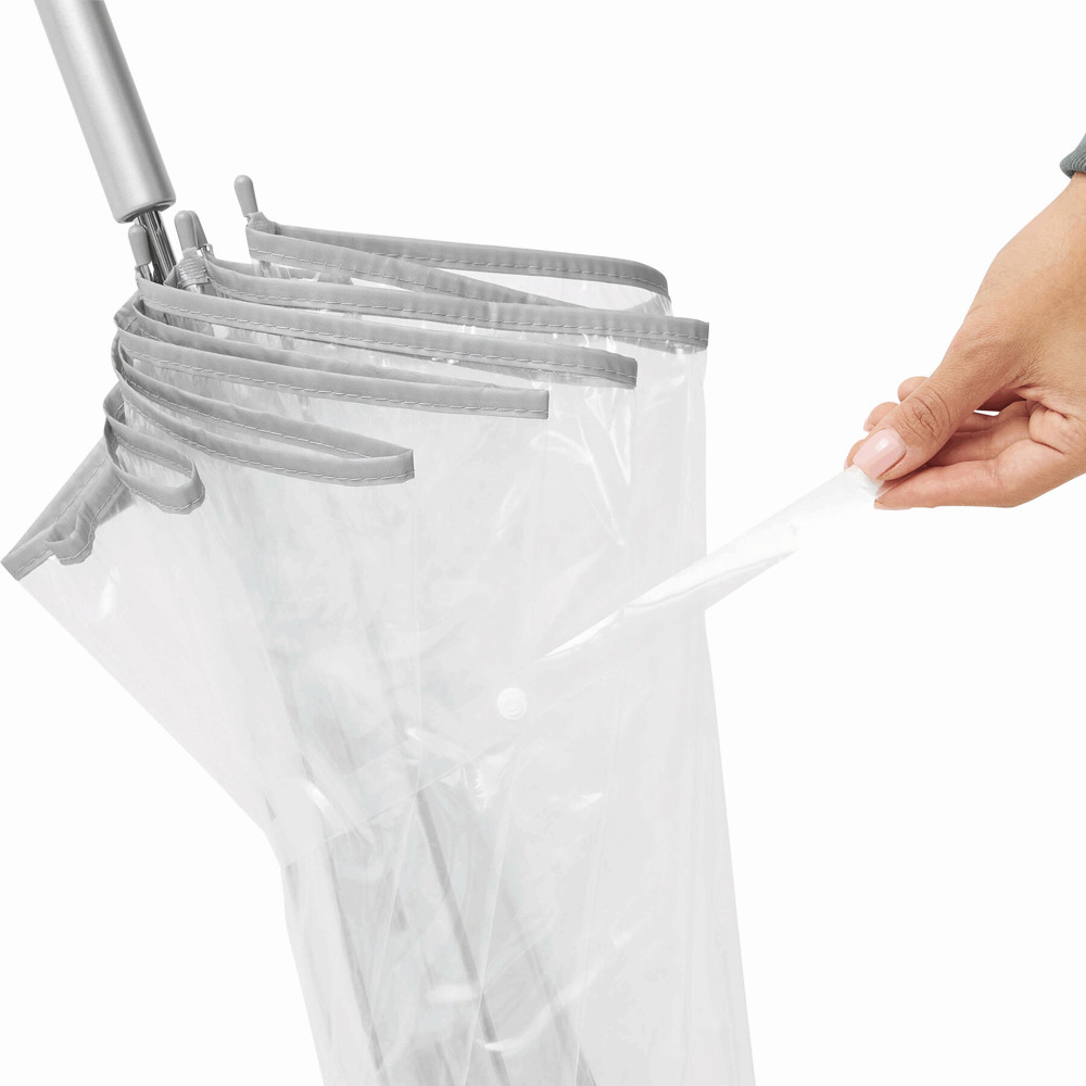 Glockenschirm BELLEVUE: Metallstock und -speichen, Kunststofftips und -spitze, transparenter Kunststoffgriff mit Luftblaseneffekt, transparente POE-Bespannung mit silberfarbener Paspelierung und Druckknopfverschluss