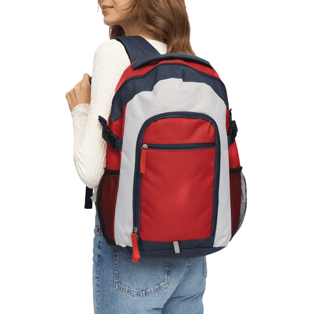 Rucksack MARINA: Reißverschluss-Hauptfach, Reißverschluss-Vortasche mit extra Reißverschluss-Fach, 2 seitliche Netzeinsteckfächer, seitliche Kompressionsgurte, verstärkter Tragegriff, gepolsterte Schultergurte und Rückenbereich